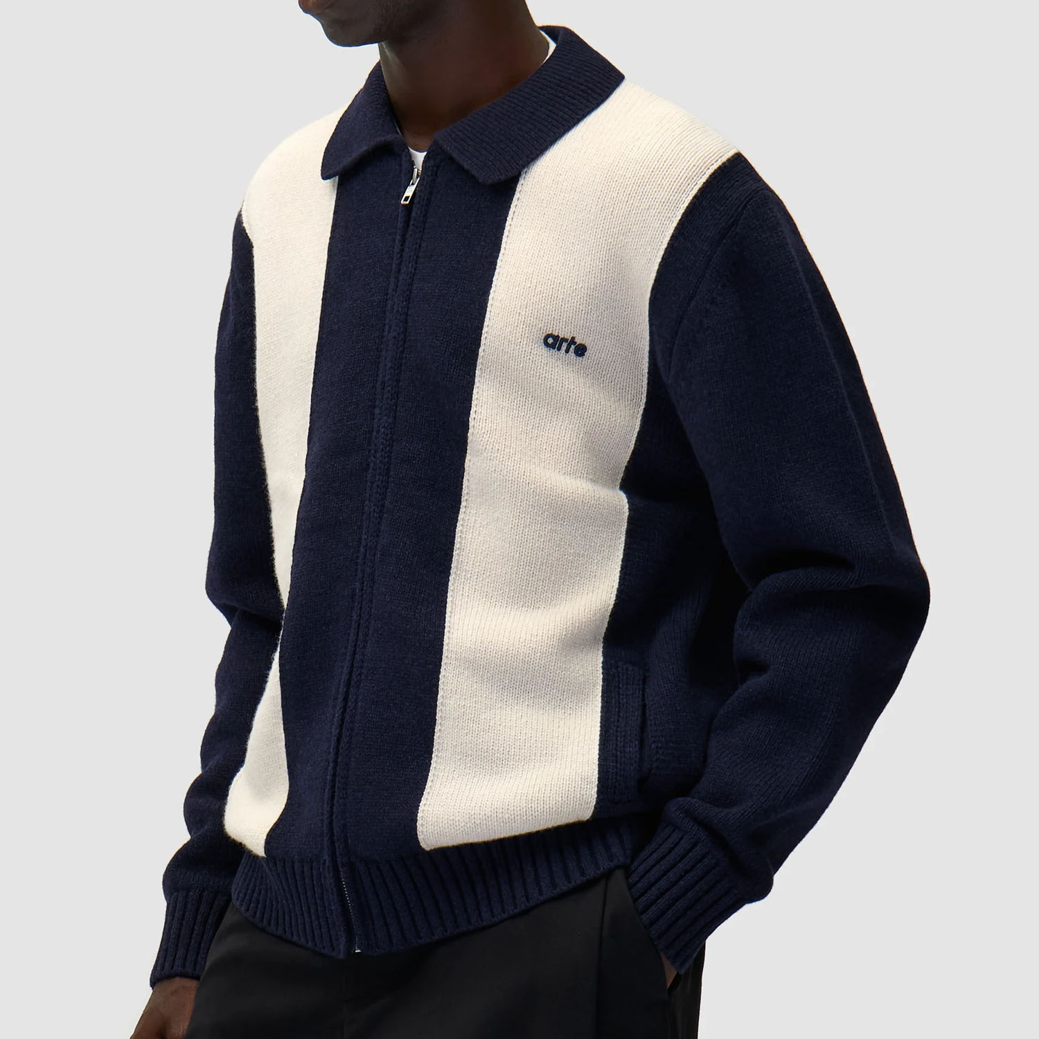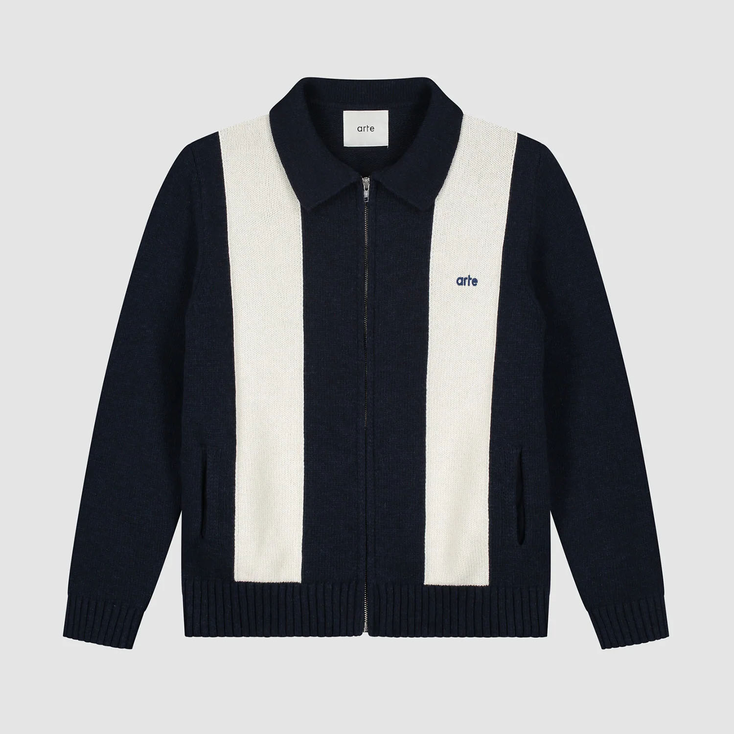 Arte Cardigan Blue/White – Crafted from a premium wool blend, this boxy-fit cardigan features a bold striped design in navy and cream. Equipped with a full-length zipper and an embroidered Arte logo on the left chest, it's a stylish and comfortable layering piece.