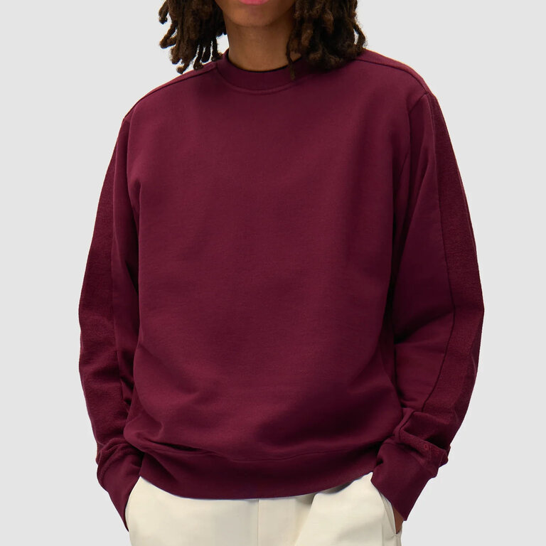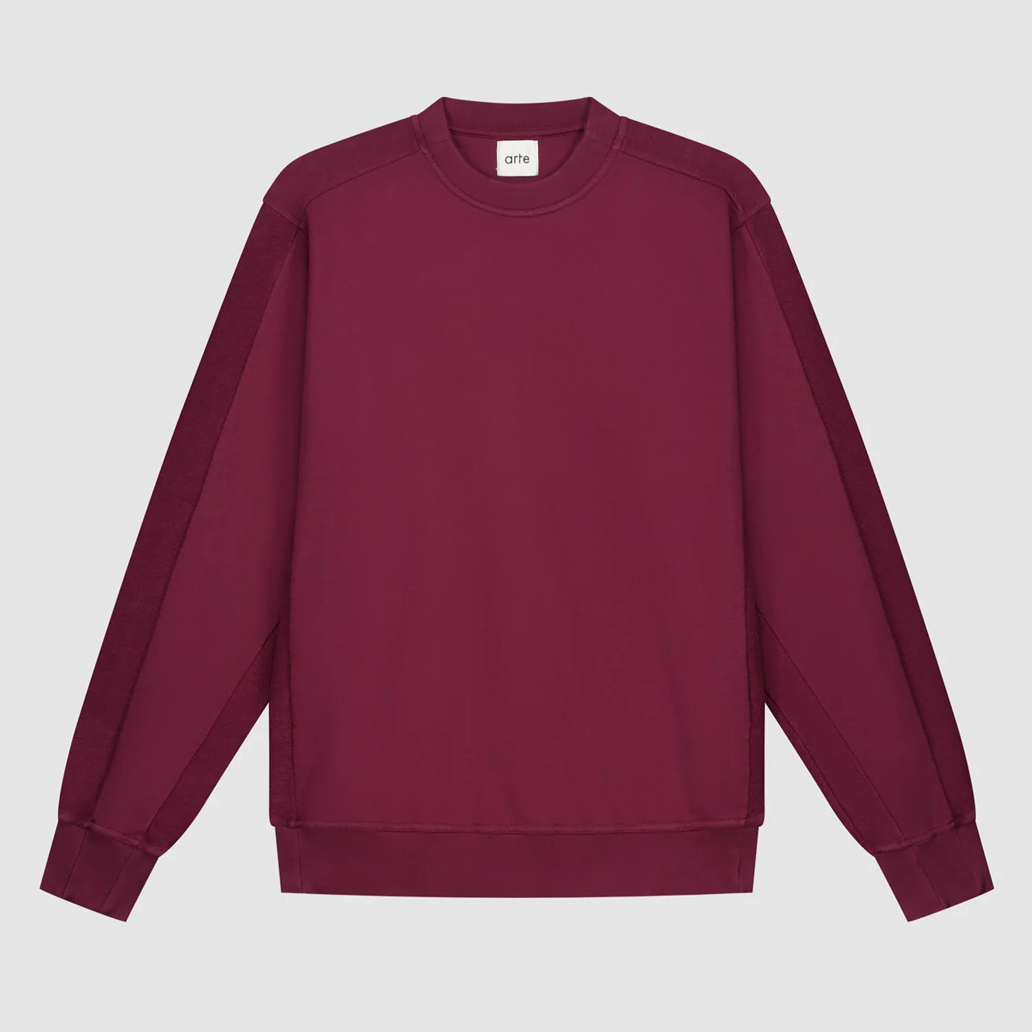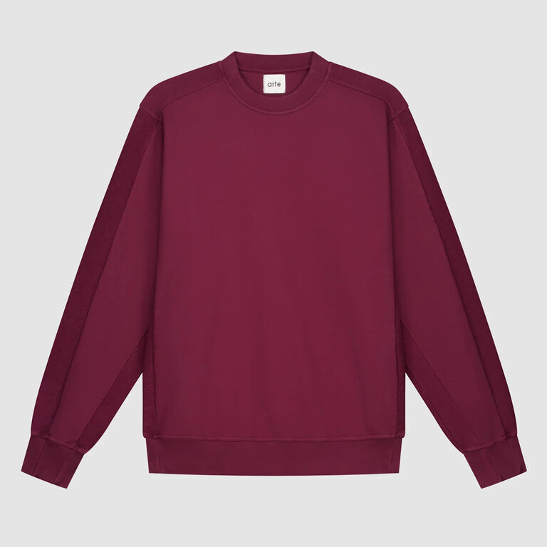 Arte In/Out Crewneck Bordeaux – premium heavyweight cotton sweatshirt featuring a reversible design with contrasting textures. Relaxed fit, slightly higher neck, ribbed cuffs, hem, and tonal embroidered logo on the left sleeve.