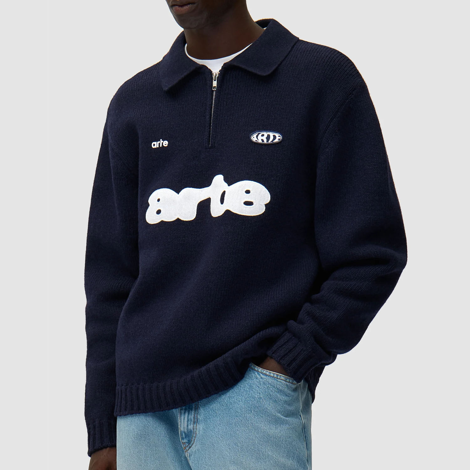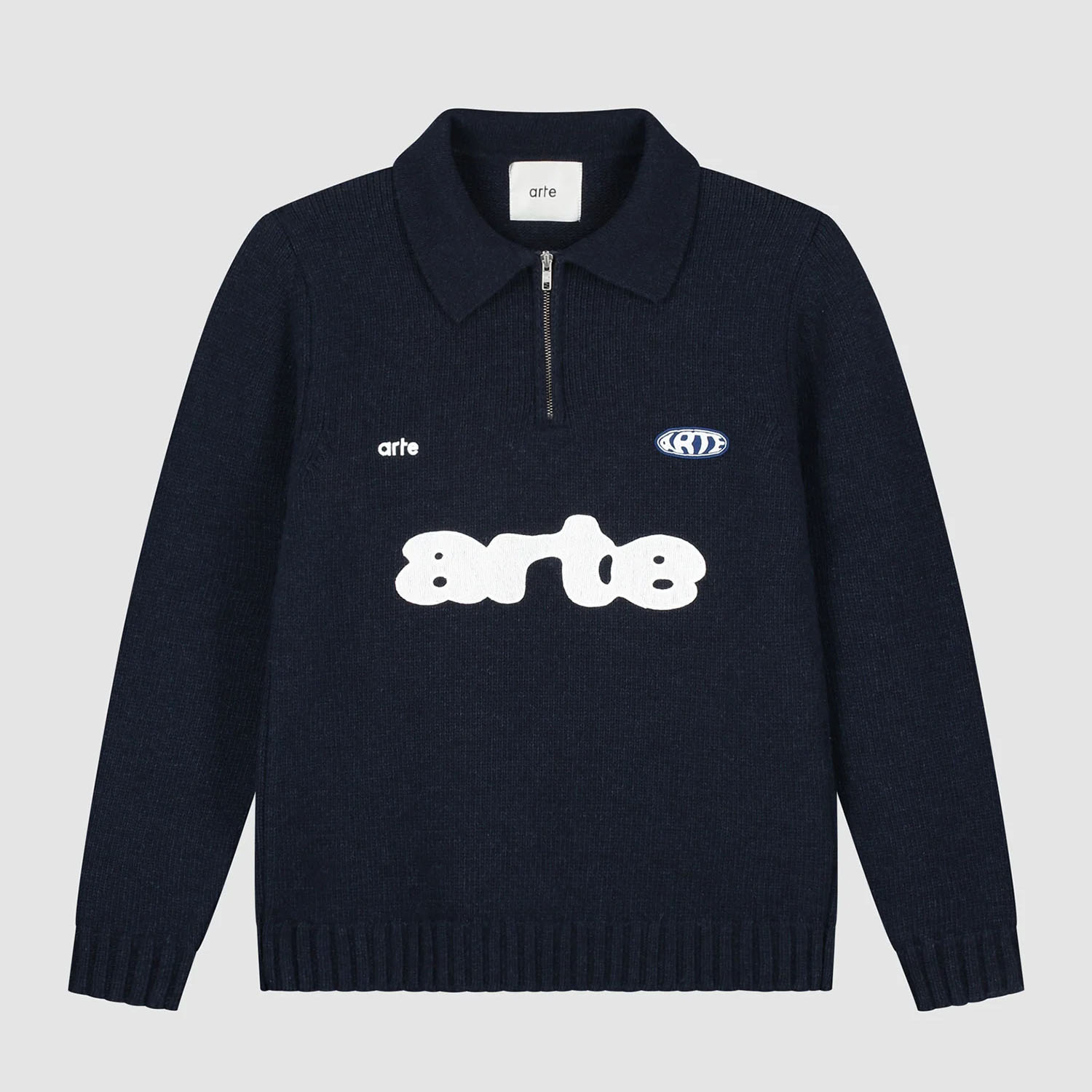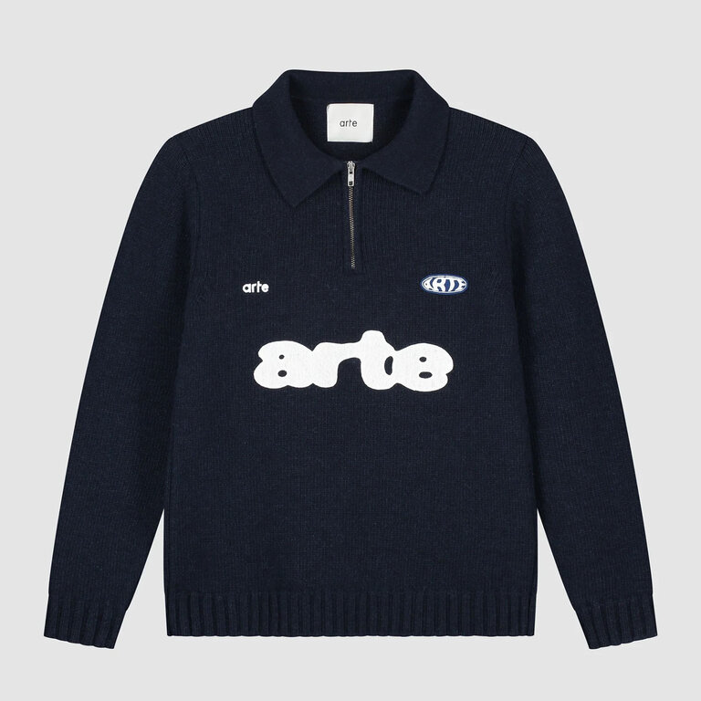 Arte Polo Navy – premium wool-blend knitted polo with a relaxed quarter-zip fit. Features a white embroidered Arte logo on the chest. Ideal as a versatile layering piece for cooler days.