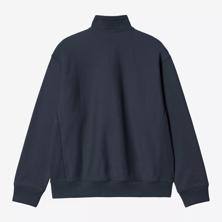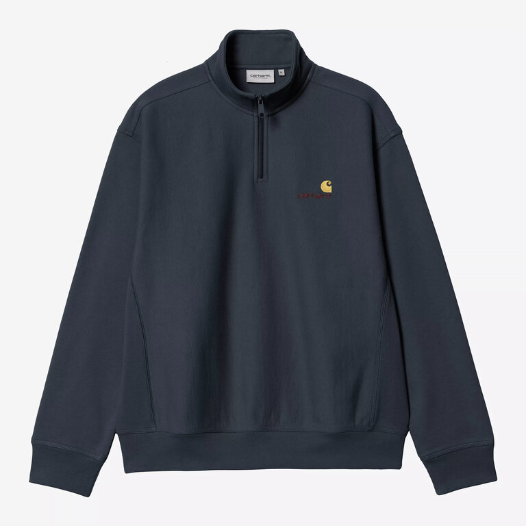 The Carhartt WIP Half Zip American Script in Deep Night is a classic sweatshirt made from a soft cotton-blend jersey. Featuring a half-zip collar and embroidered logo, it delivers everyday comfort with timeless streetwear style.