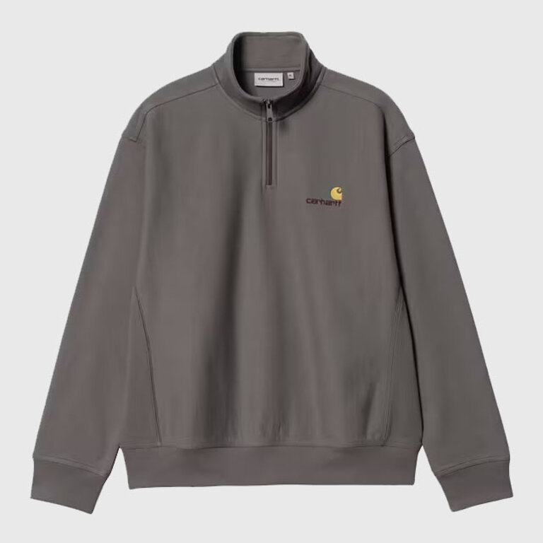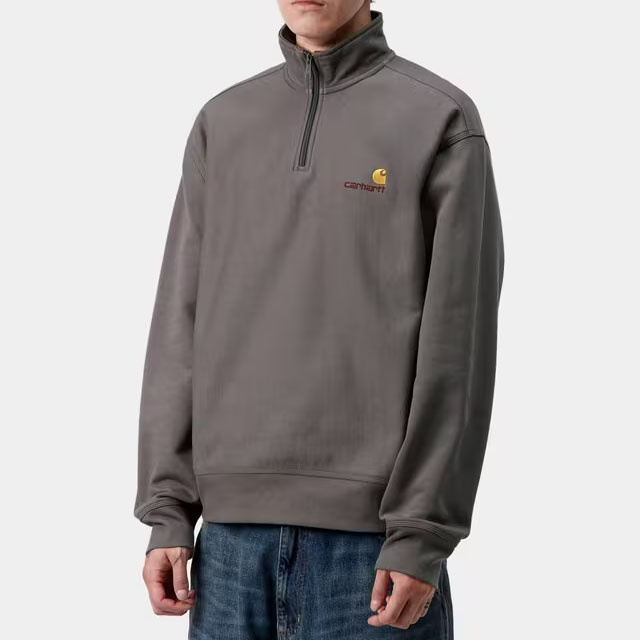 Carhartt WIP Half Zip American Script Porphyry – 100% cotton fleece half-zip pullover with relaxed fit. Features stand-up collar, ribbed cuffs & hem, and “American Script” chest embroidery. Perfect for casual and streetwear layering.