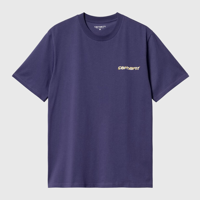 The Carhartt WIP Noodle Soup T-Shirt in Aura is made from lightweight cotton jersey in a regular fit. Graphic prints appear on the chest and back.