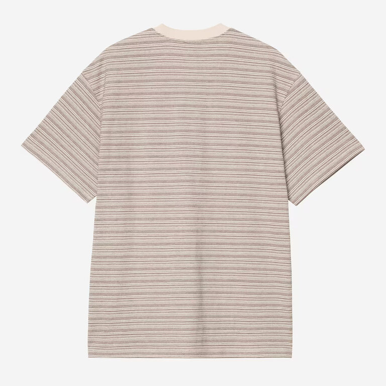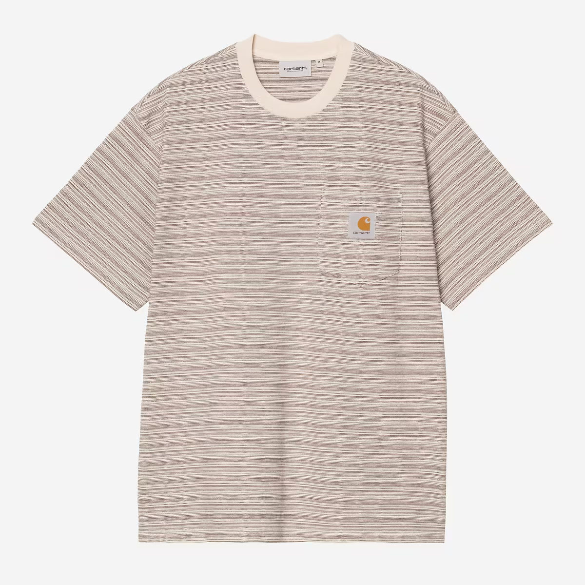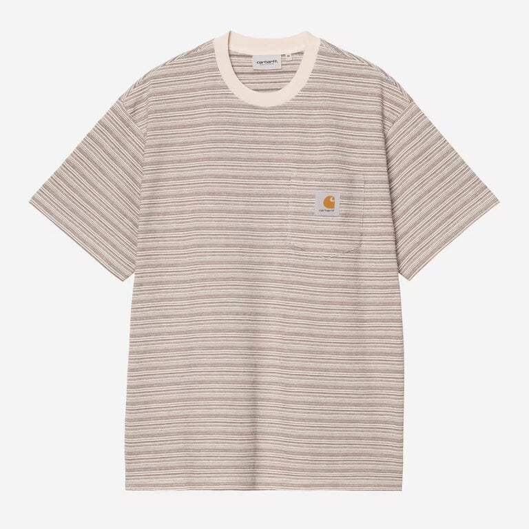 The Carhartt WIP Gellar Pocket T-Shirt in Gellar Stripe Wax features a relaxed crew neck silhouette, allover jacquard stripe pattern, and a single chest patch pocket with woven branding label.