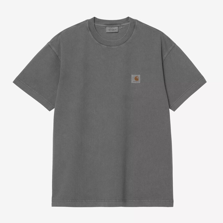 Carhartt WIP S/S Vista T-Shirt Black is made from midweight cotton single jersey (≈230 g/m²), garment-dyed for a deep, lived-in shade. It has a loose fit with relaxed shoulders, a slightly longer hem, and a woven square label on the left chest.