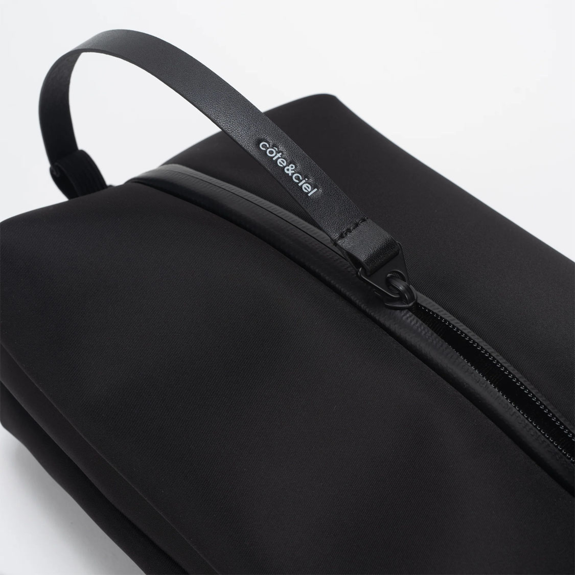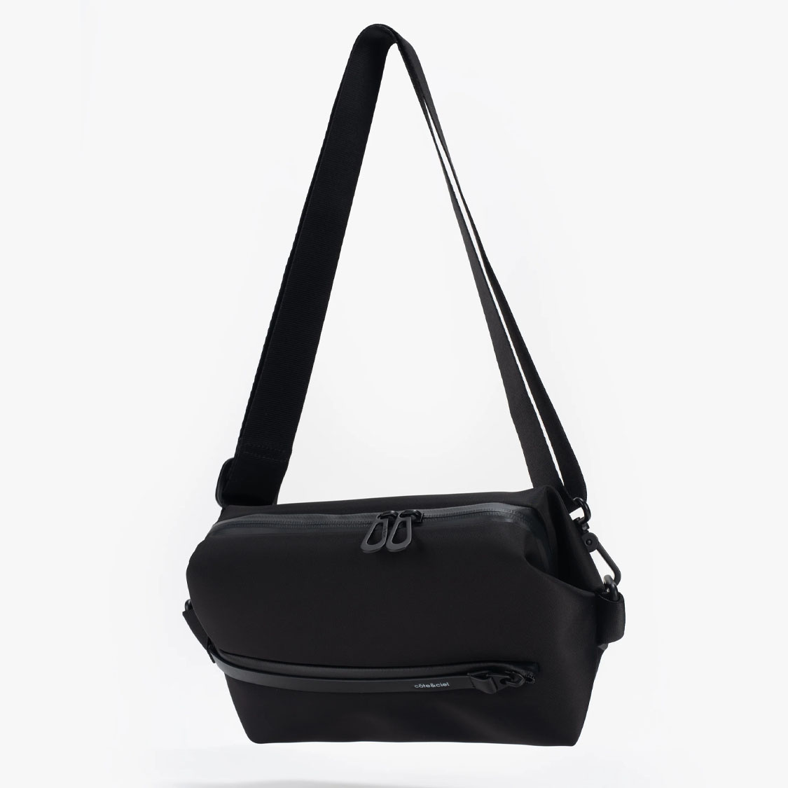 Côte&Ciel ENS Sleek Black – compact 3.5 L crossbody bag in water-repellent Sleek Nylon. Features external front pocket, interchangeable carry strap, and leather zipper pull with côte&ciel engraving.