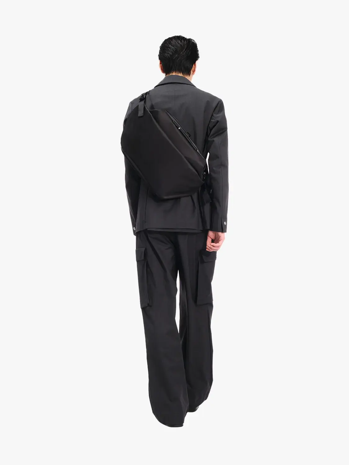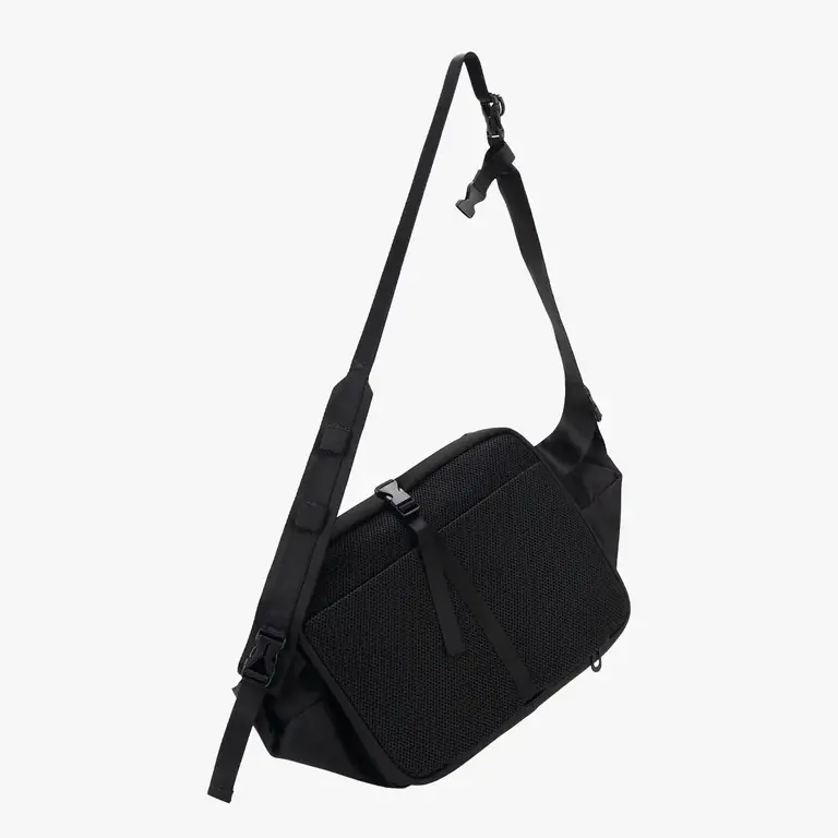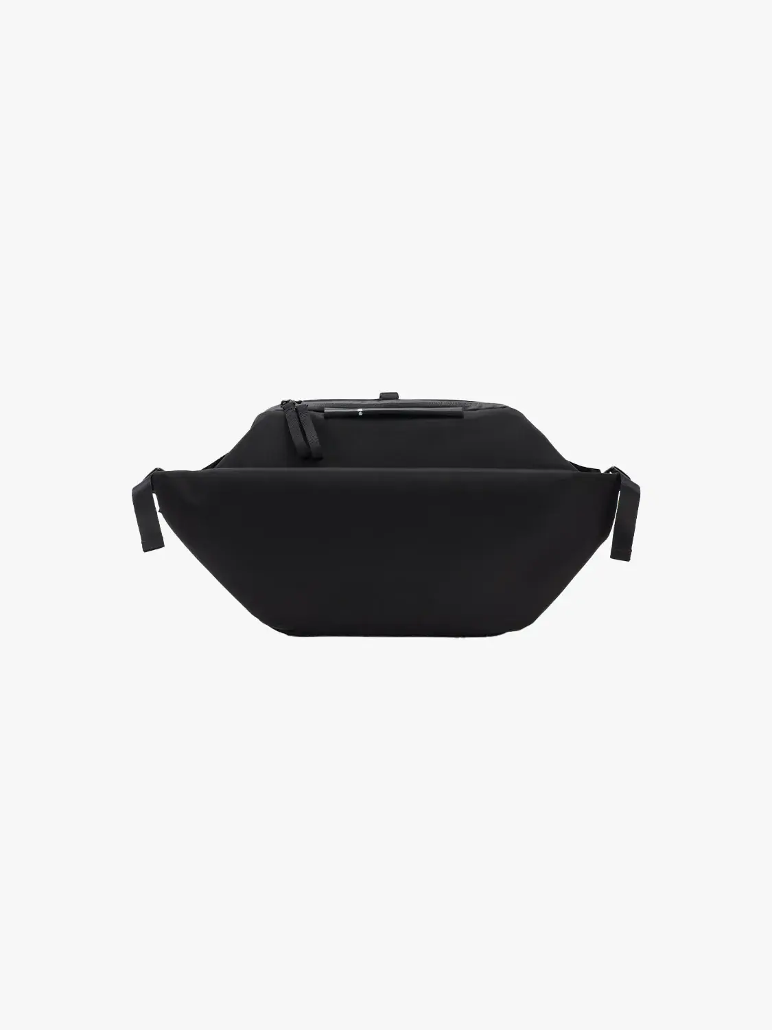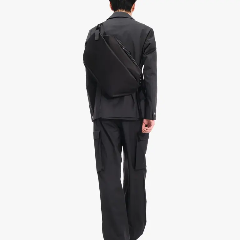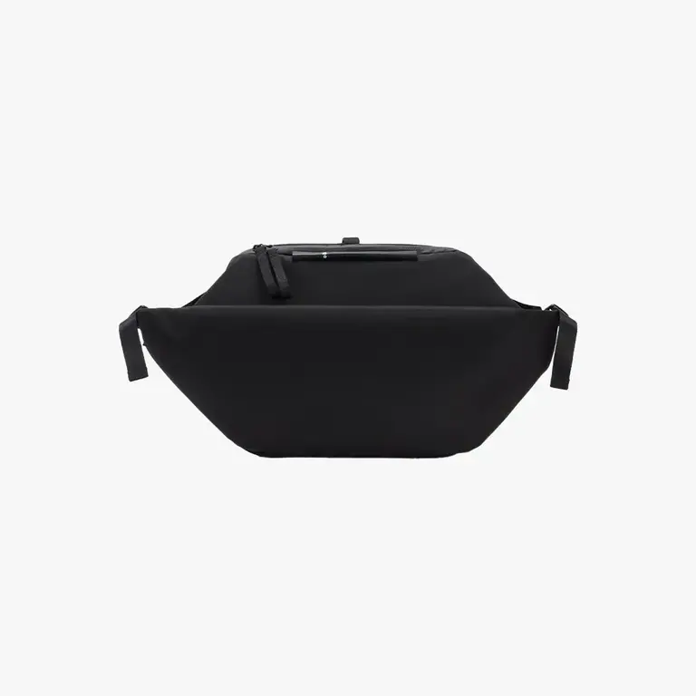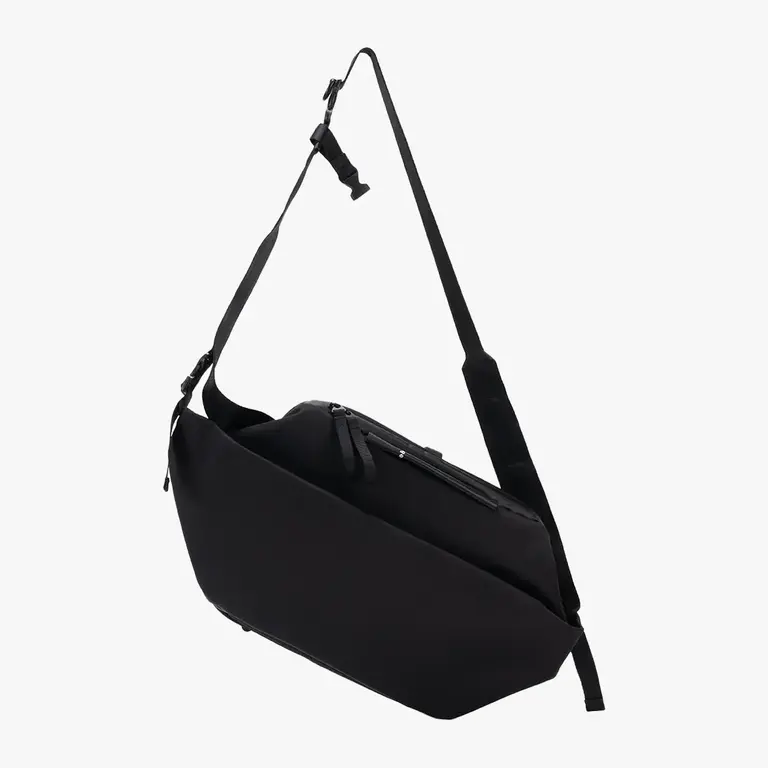 CôtCôte&Ciel Isarau L Sleek Black – versatile 14.5 L sling bag in water-repellent Sleek Nylon. Features expandable compartment, padded laptop sleeve (fits up to 14"), chest strap, and suitcase pass-through. Wearable crossbody, chest, or back.