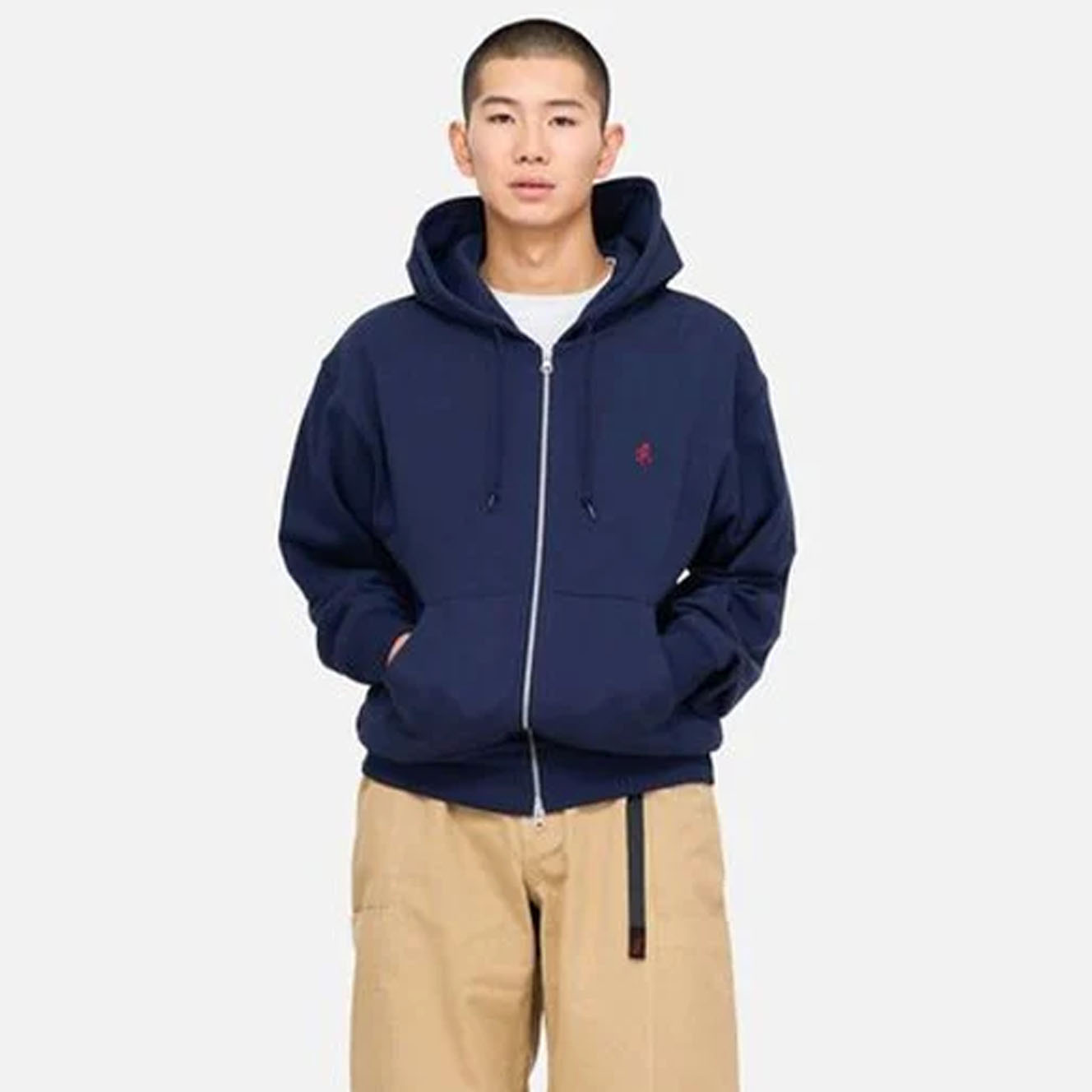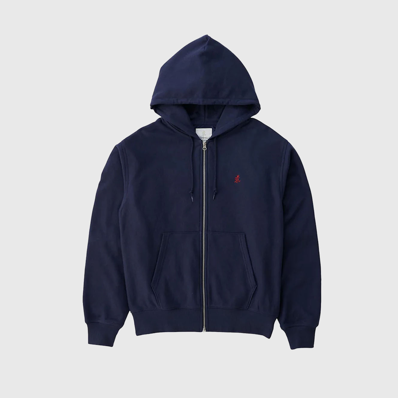 The Gramicci One Point Zip Hooded Sweatshirt in Dark Navy is made from 100% fleeceback cotton. It includes a full zip front, drawstring hood, handwarmer pockets, and the “Running Man” embroidered logo for a clean outdoor-inspired style.