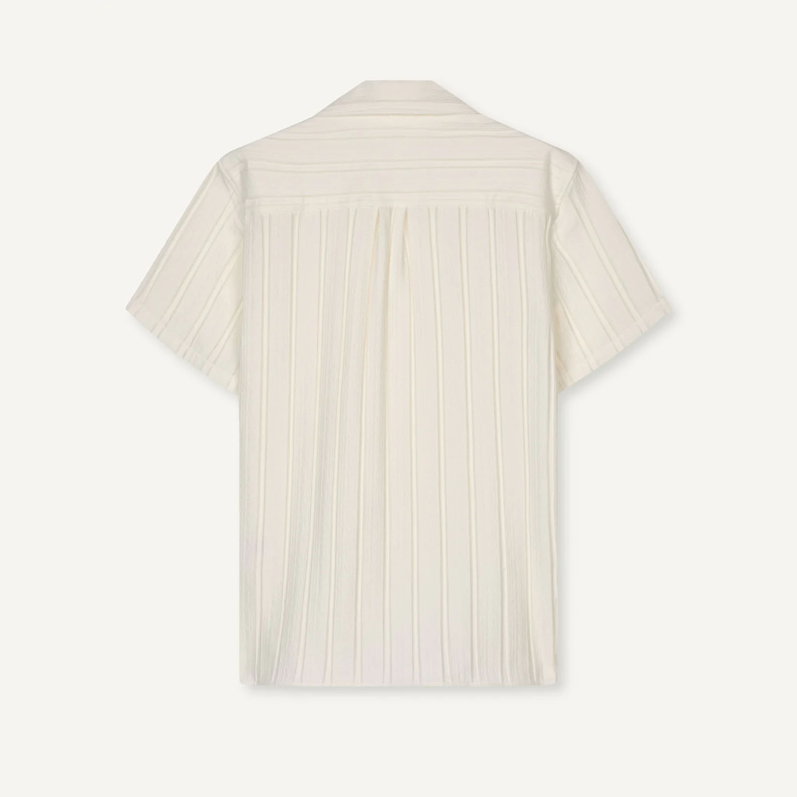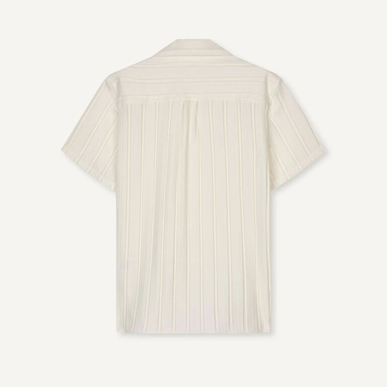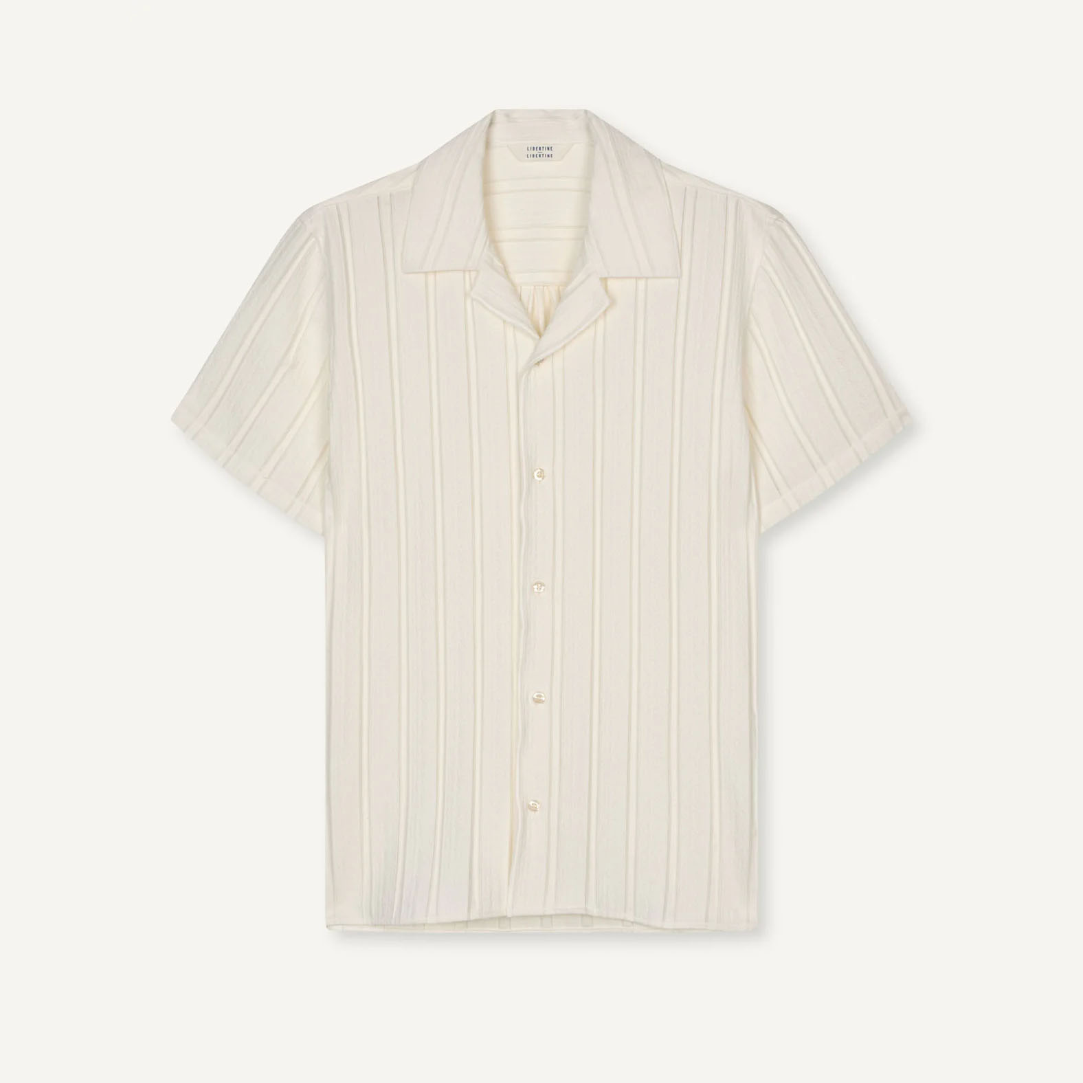 Libertine-Libertine Cave 3614 Shirt Textured Ecru – Classic short-sleeve camp-collar shirt in bouclé-weave fabric, made from 74% viscose, 20% polyamide, and 6% elastane. Lightweight, textured, and crafted in North Macedonia.