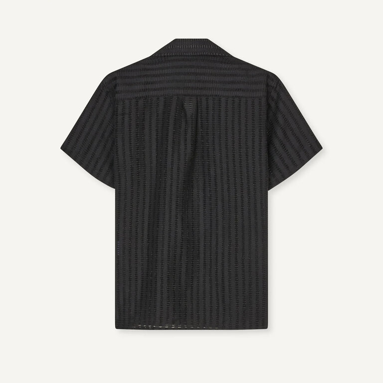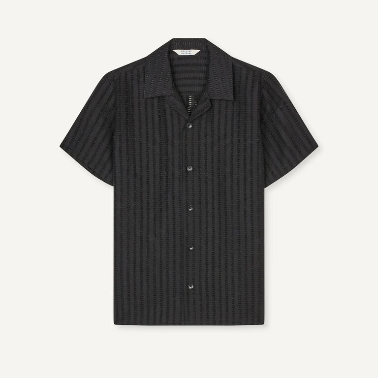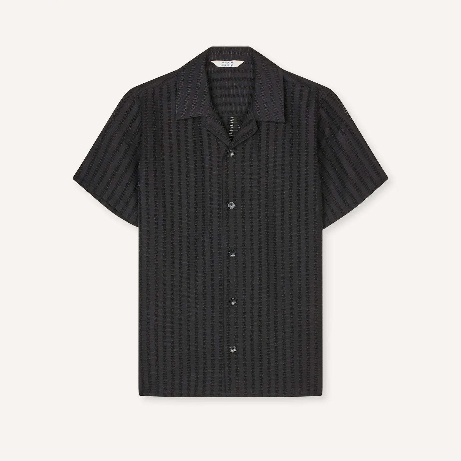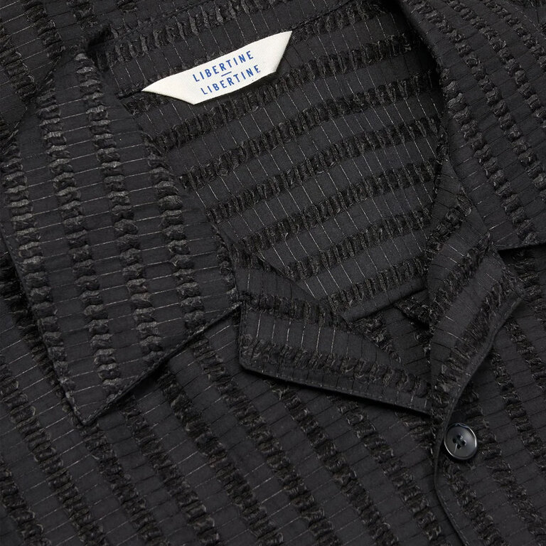 Libertine-Libertine Cave 3616 Shirt Black – Classic short-sleeve shirt with a camp collar and chest pocket, cut from a textured jacquard weave fabric blend of 86% cotton, 12% recycled polyamide, and 2% PA. Crafted in North Macedonia.