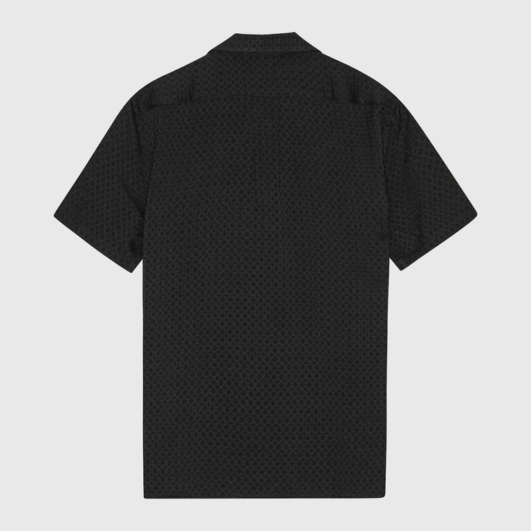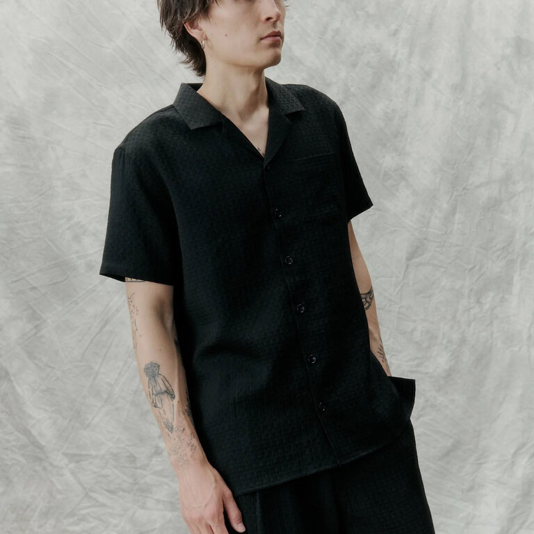 The Libertine-Libertine Cave Shirt 2209 in Black Geo is cut from a is cut from a jacquard weave fabric, with a tactile surface. The Cave shirt is an classic short sleeve shirt.