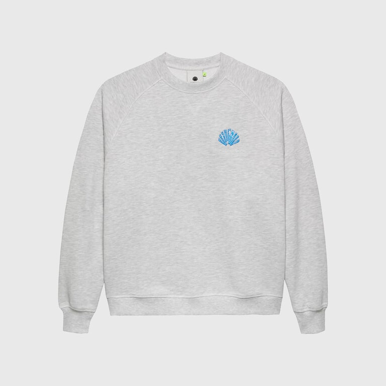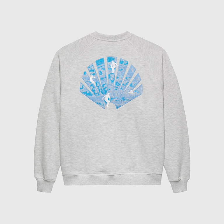 New Amsterdam Surf Association Sea Glow Crewneck Ash – Raglan crewneck in relaxed unisex fit crafted from 455 GSM mélange yarn cotton terry, garment-washed for softness. Detailed with embroidered surfers and waves logo on front and back.