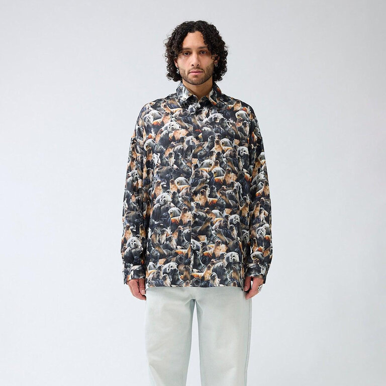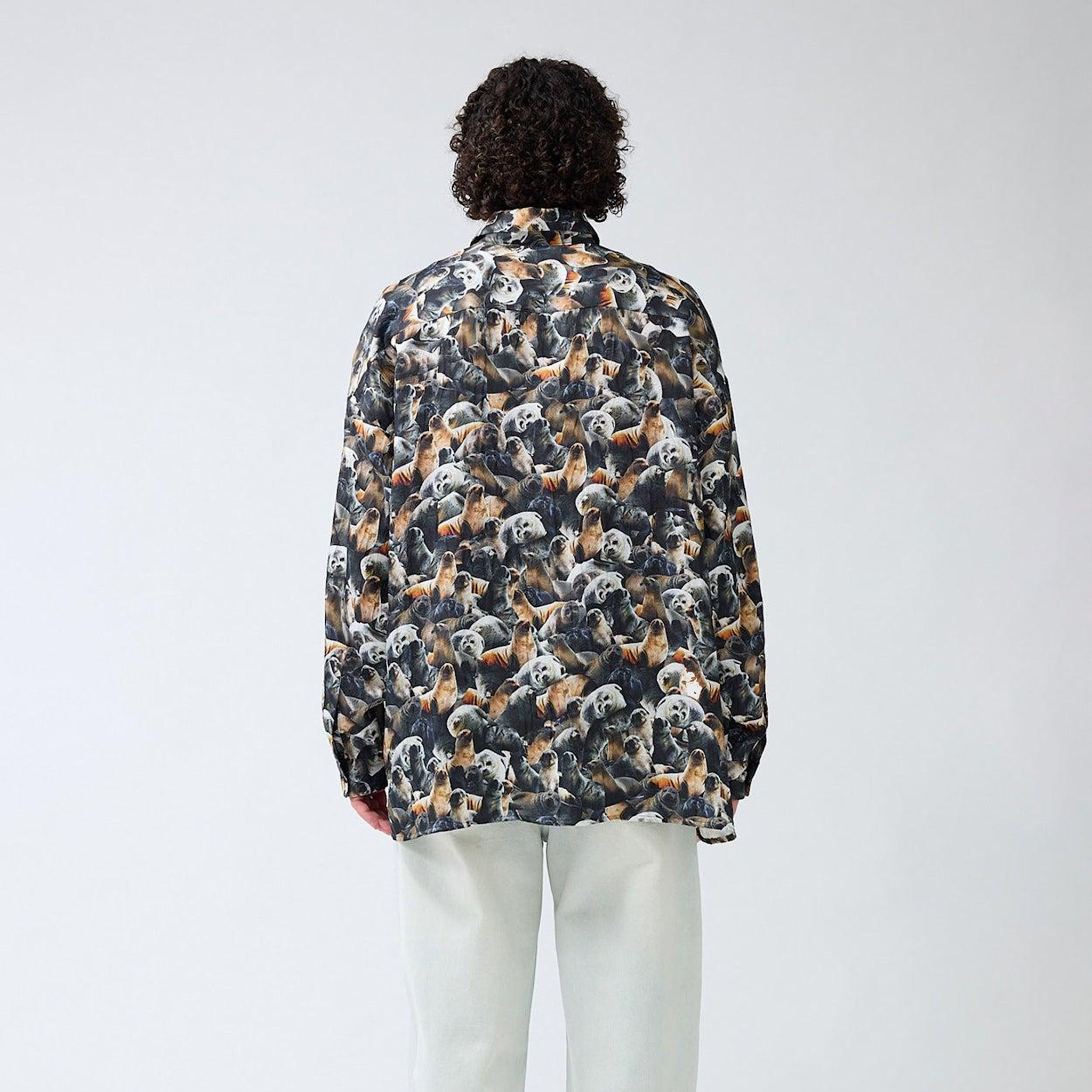 The NASA Seal Shirt is an button-up shirt features a seasonal seal all-over print with a crinkled finish on the fabric. Cut to a relaxed fit and hip length.