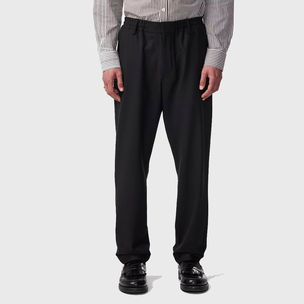 NN07 Billie Pant 1088 Black – lightweight trousers crafted from a 213 g/m² blend of 53% recycled polyester, 43% certified wool, and 4% elastane. Features a regular fit with tapered leg, elastic waistband with hidden drawstring, and a neat press fold.