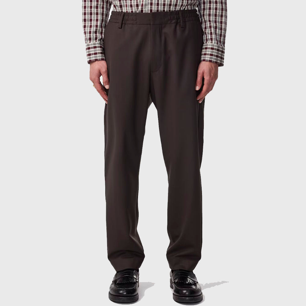 NN07 Billie Pant 1088 Demitasse – lightweight trousers crafted from a 213 g/m² blend of 53% recycled polyester, 43% certified wool, and 4% elastane. Features a regular fit with tapered leg, elastic waistband with hidden drawstring, and a neat press fold.