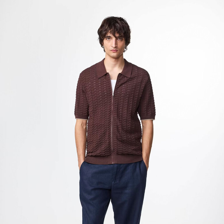 The NN07 Gustav Full Zip 6636 in Coffee is an polo crafted from an organic cotton high-twist yarn with a crisp feel, featuring a full zip closure.