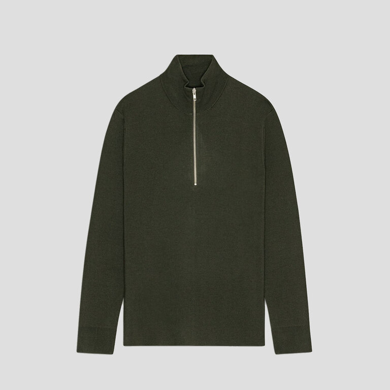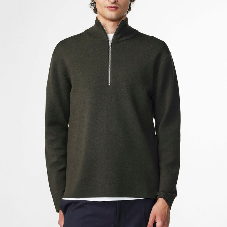 No Nationality 07, NN07 for short, Harald Half-Zip 6530 in Dark Army is a polo crafted in a smooth wool blend. Knit in a Milano stitch with tubular details at the hem and cuff. Added a touch of stretch for extra comfort.