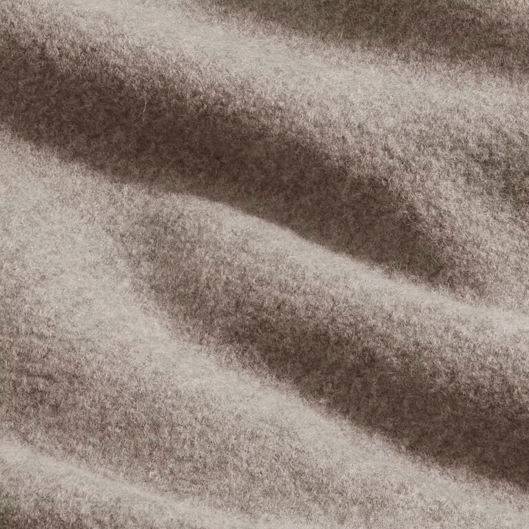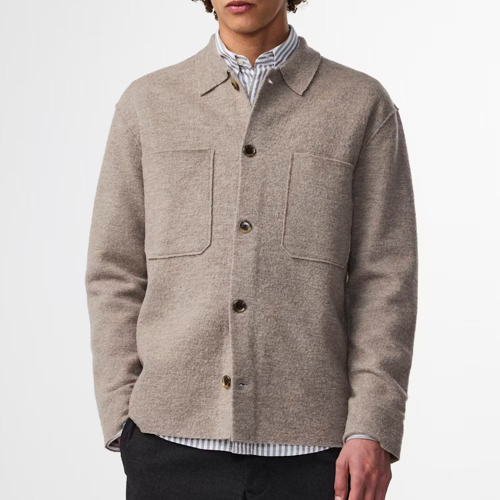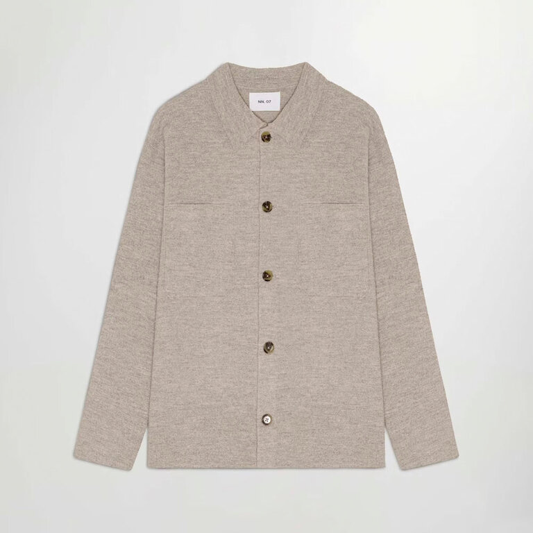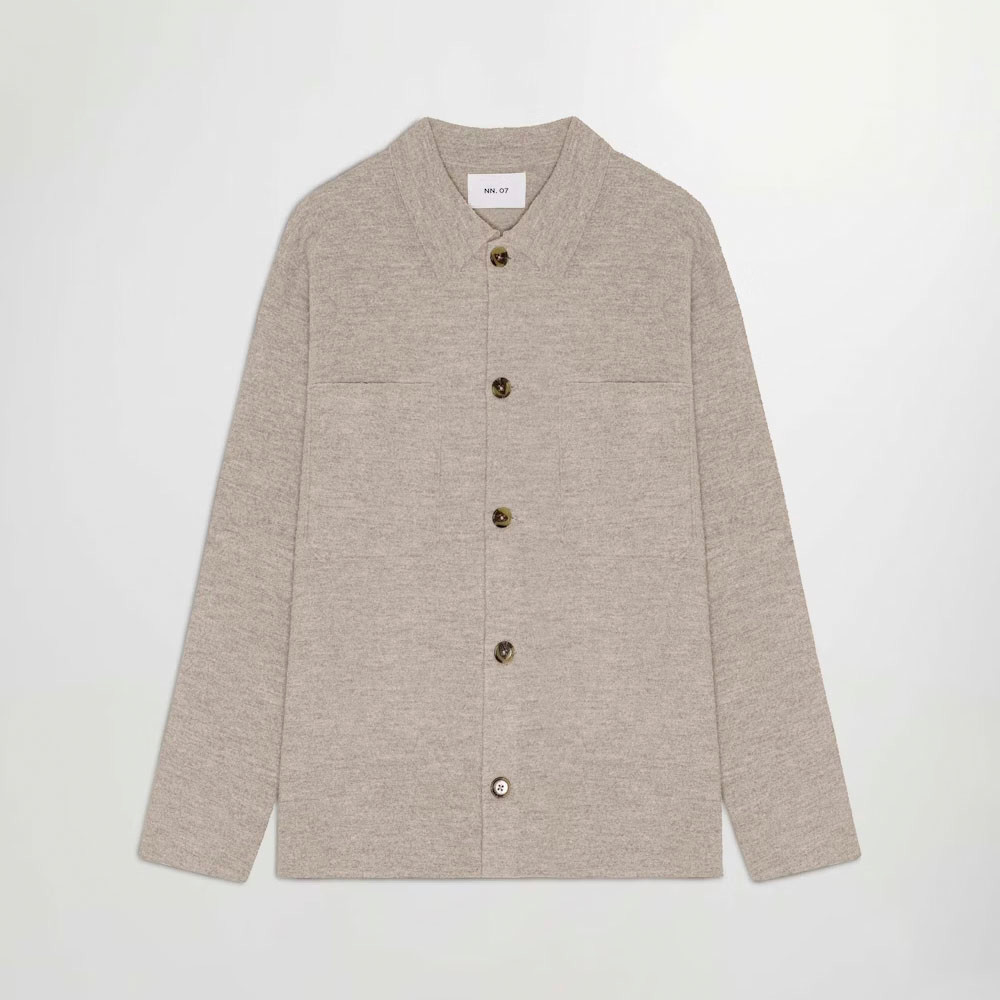 NN07 Jonas 6398 Overshirt Khaki Beige – premium boiled Merino wool overshirt in 100% merino. Soft, lightweight fabric with shirting collar, raw edges, NN.07 logo buttons, regular fit for versatile wear.