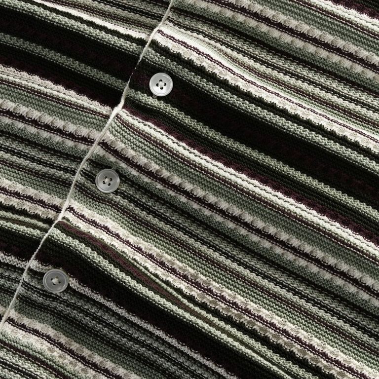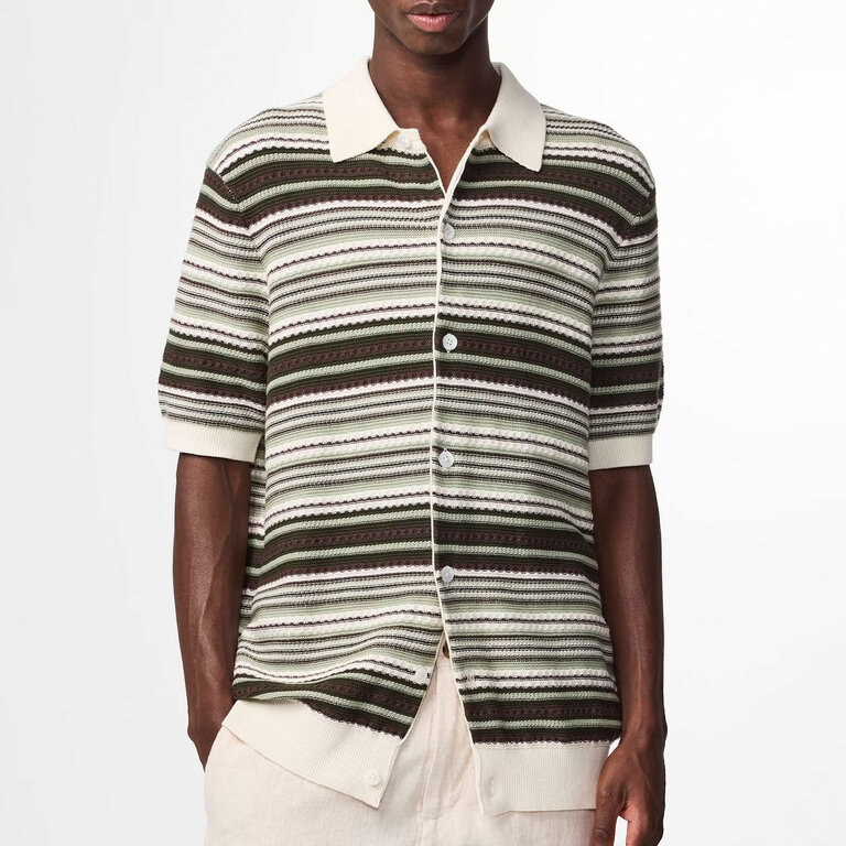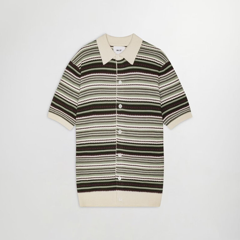 The NN07 Nolan Polo Cardigan 6686 in Green Stripe is an open-collar polo cardigan crafted in a multi-striped textured organic cotton yarn with rib-knitted edges, finished with Mother-of-Pearl buttons.