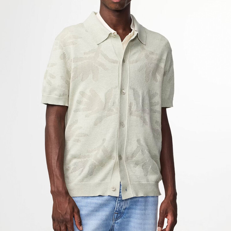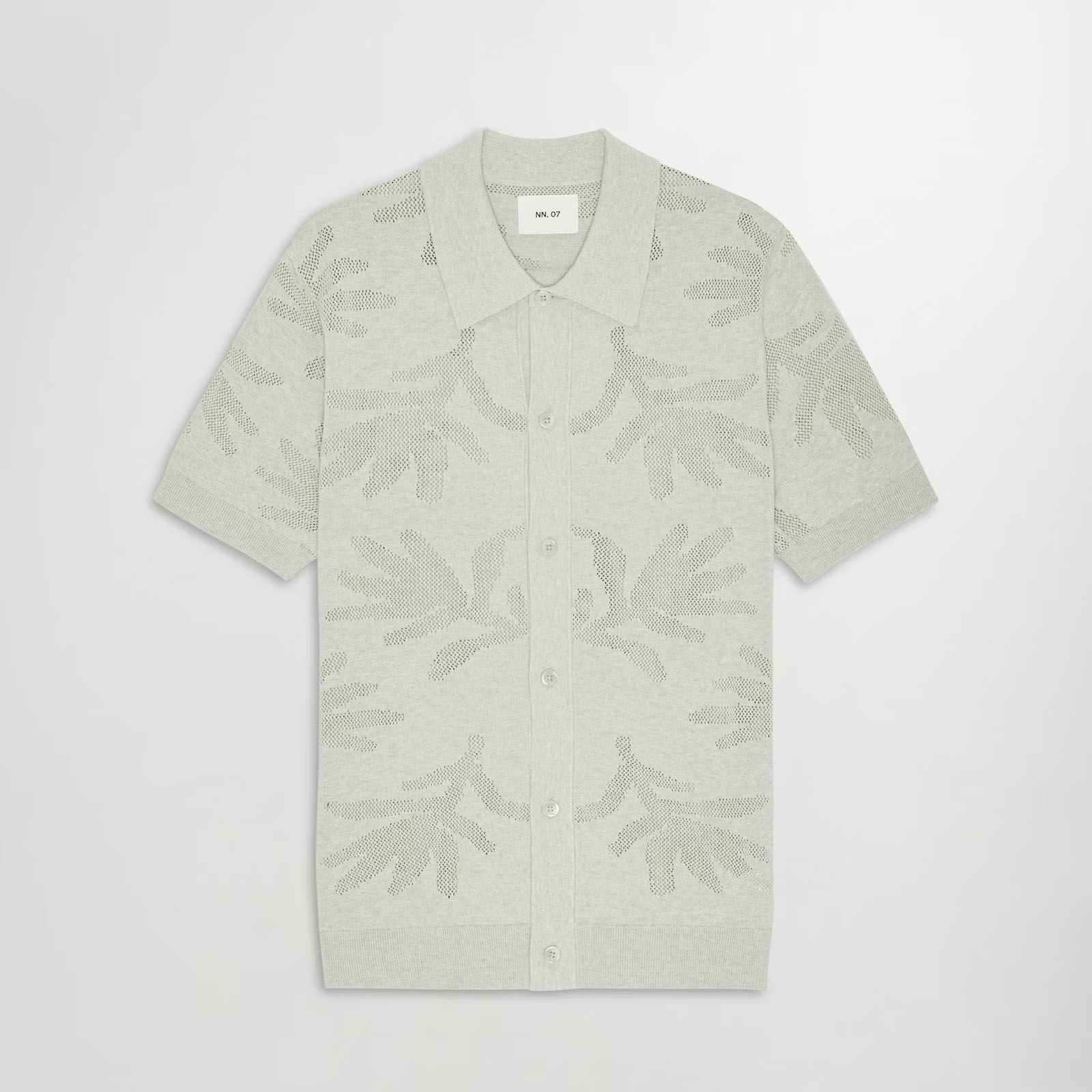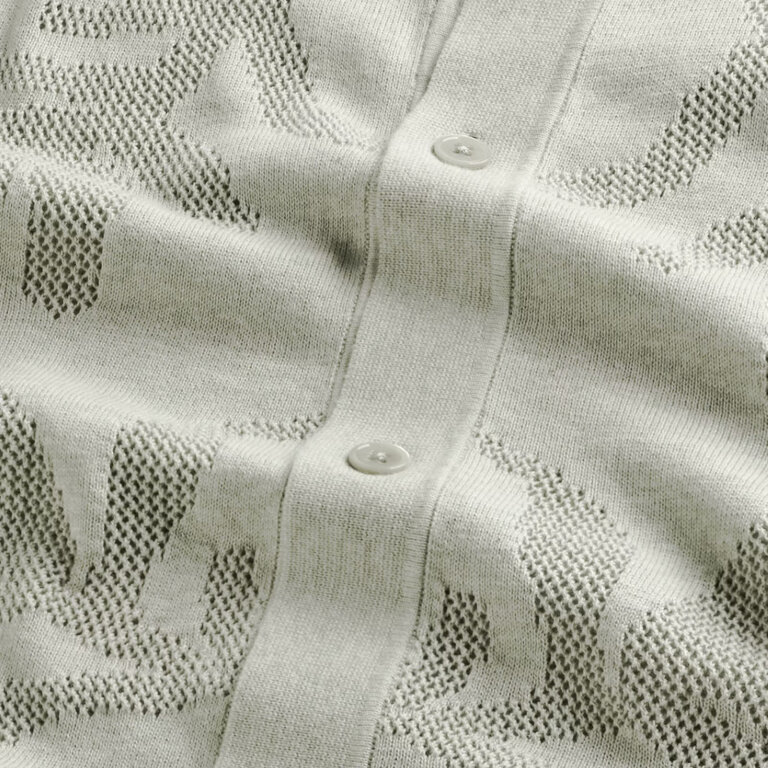 The NN07 Thor SS Cardigan 6686 in Sage Green is a knitted cardigan crafted in super fine organic cotton yarn with a graphic pointelle stitch patter on the surface, finished with Mother-of-Pearl buttons.