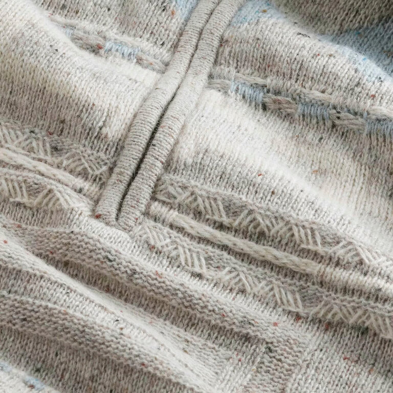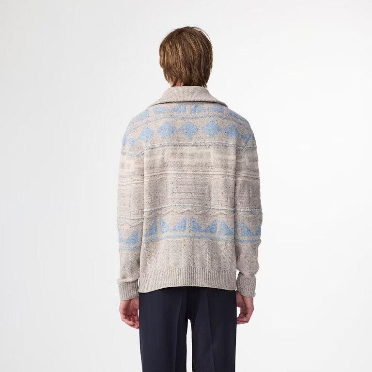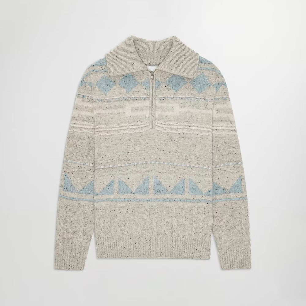 NN07 William 6697 Half Zip Ecru Multi – regular fit sweater knit from a smooth wool blend. Features Donegal-yarn multi-pattern, recycled polyamide mix, and a high zip mock neck for warmth and style.