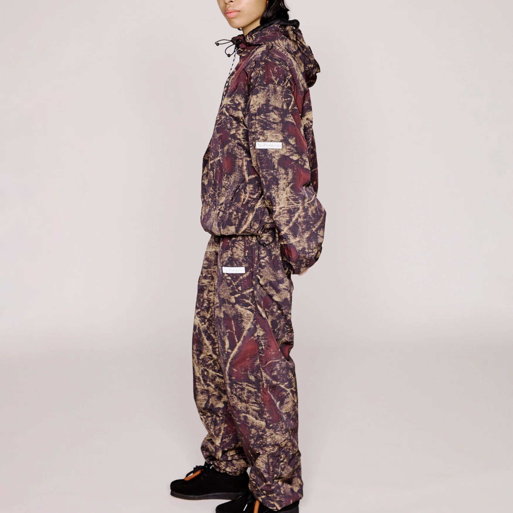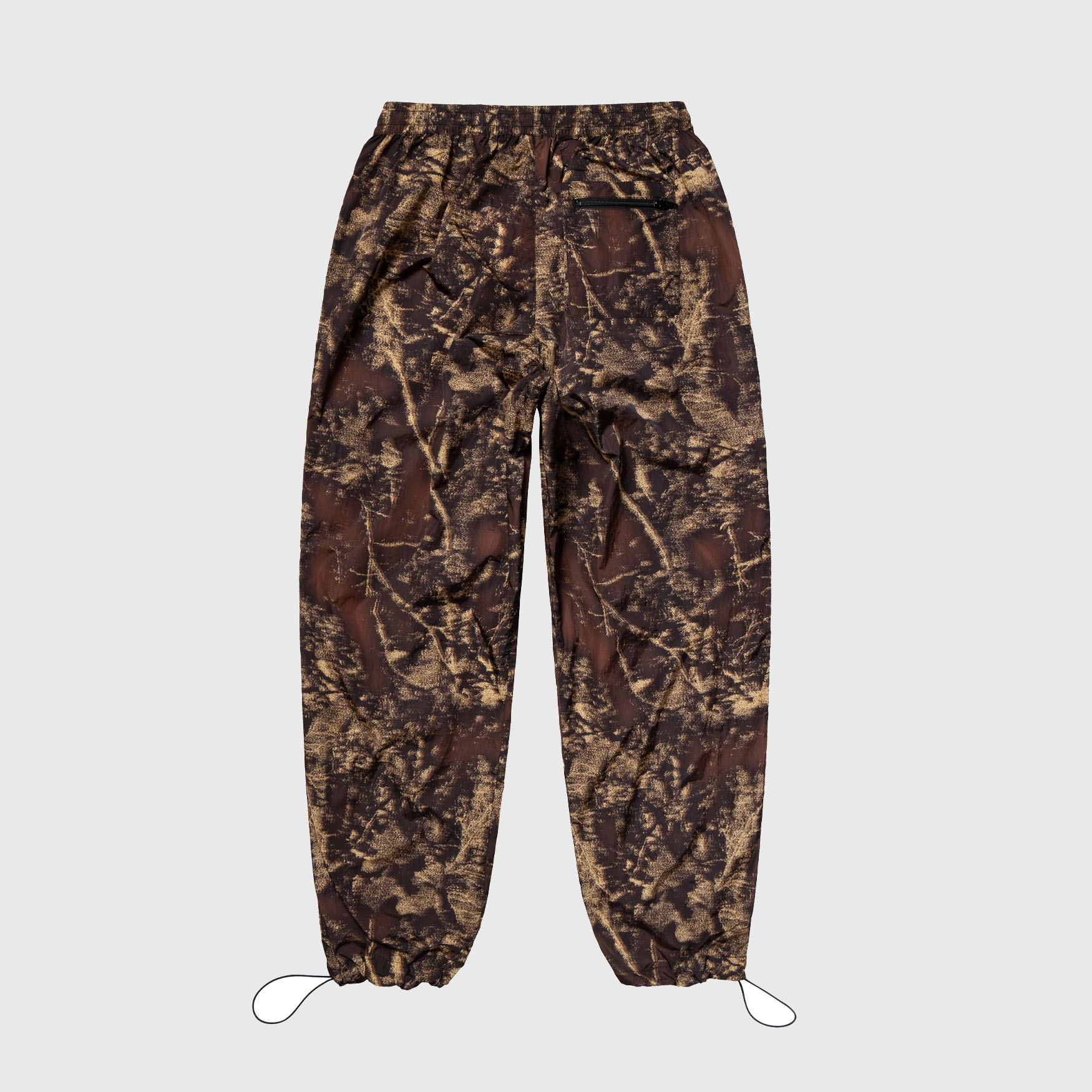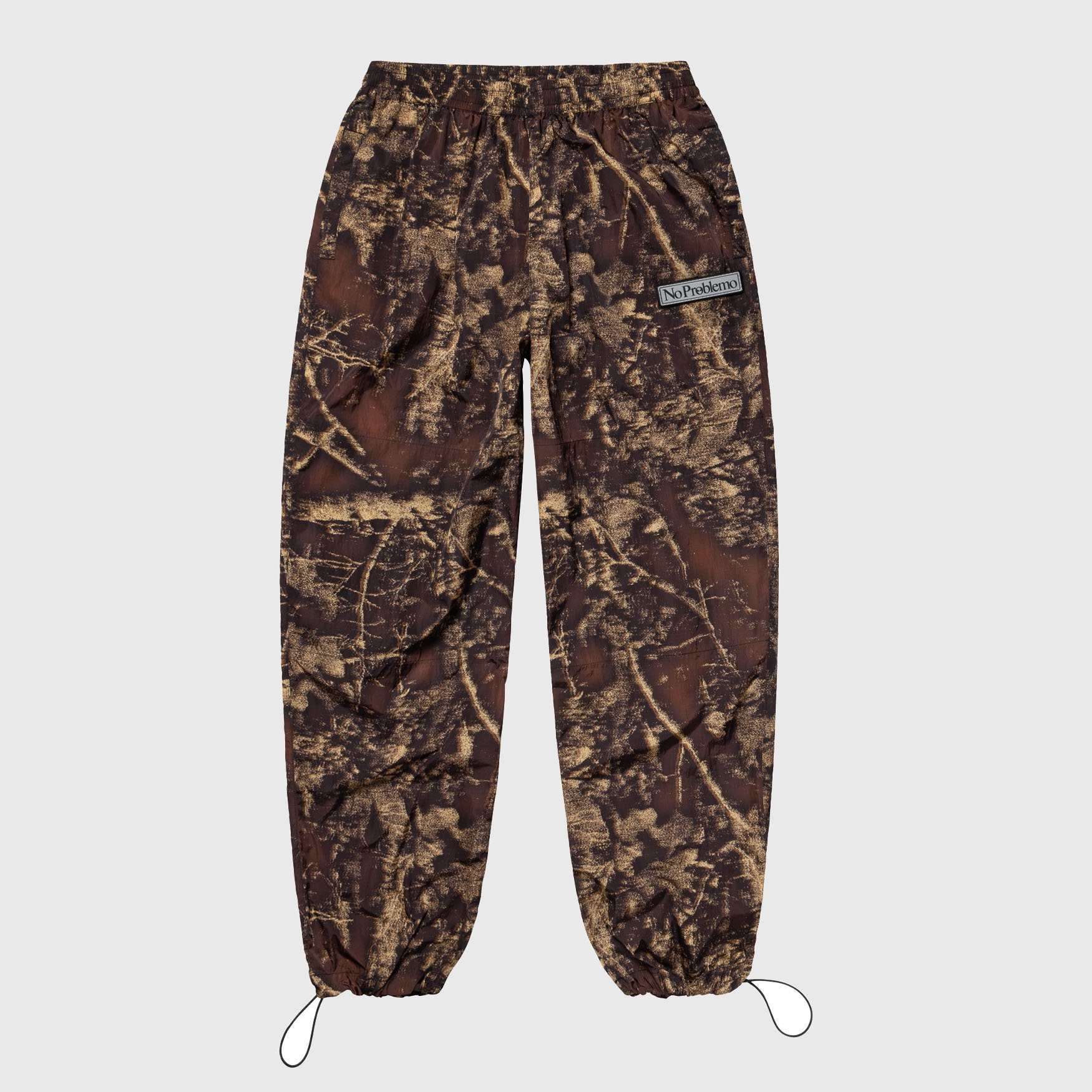 No Problemo Forest Glitch Nylon Pant Camo is a unisex track pant made of lightweight nylon with elastic waistband, ankle toggles, reinforced knees, back zip patch pocket, and full “Tree Camo” print with reflective branding.