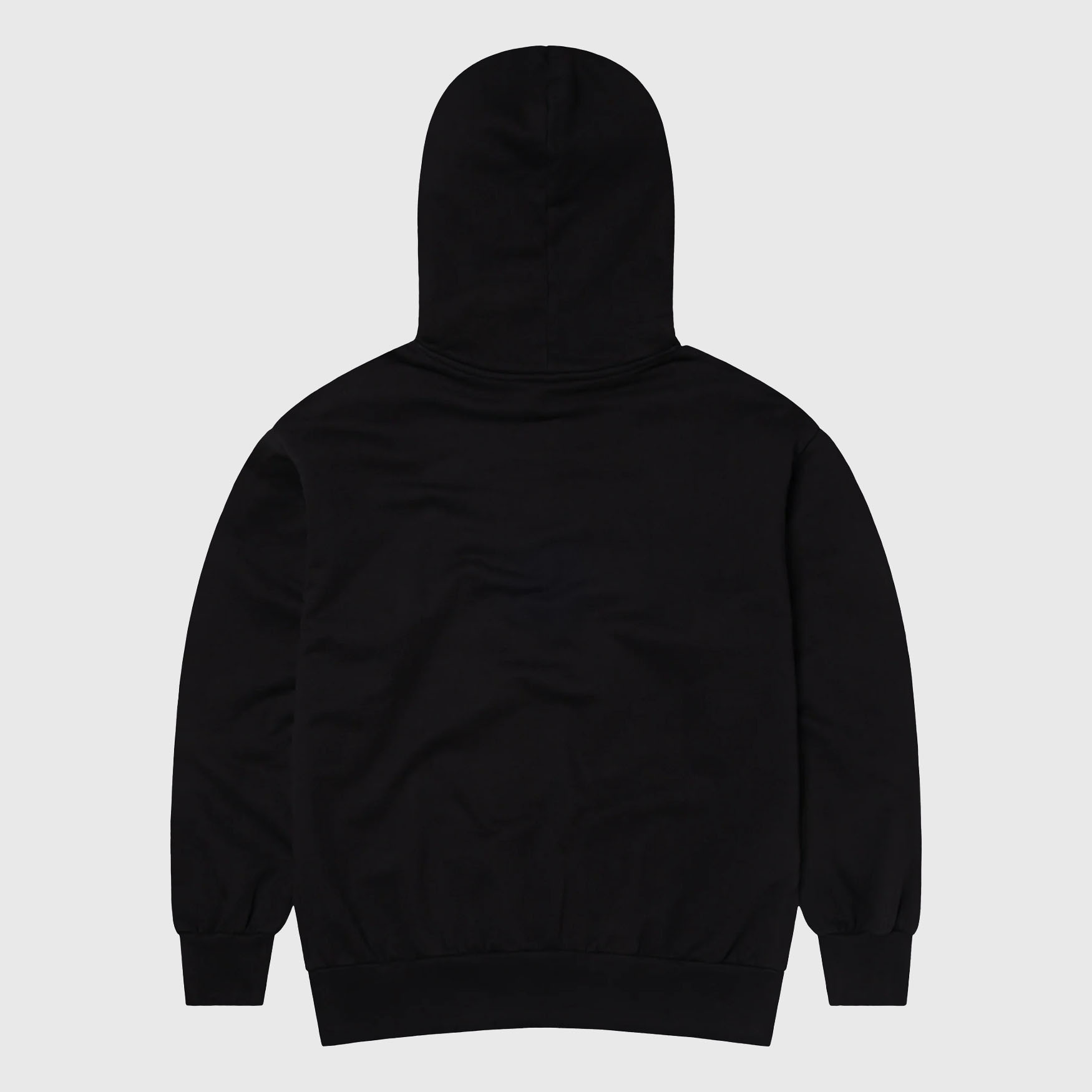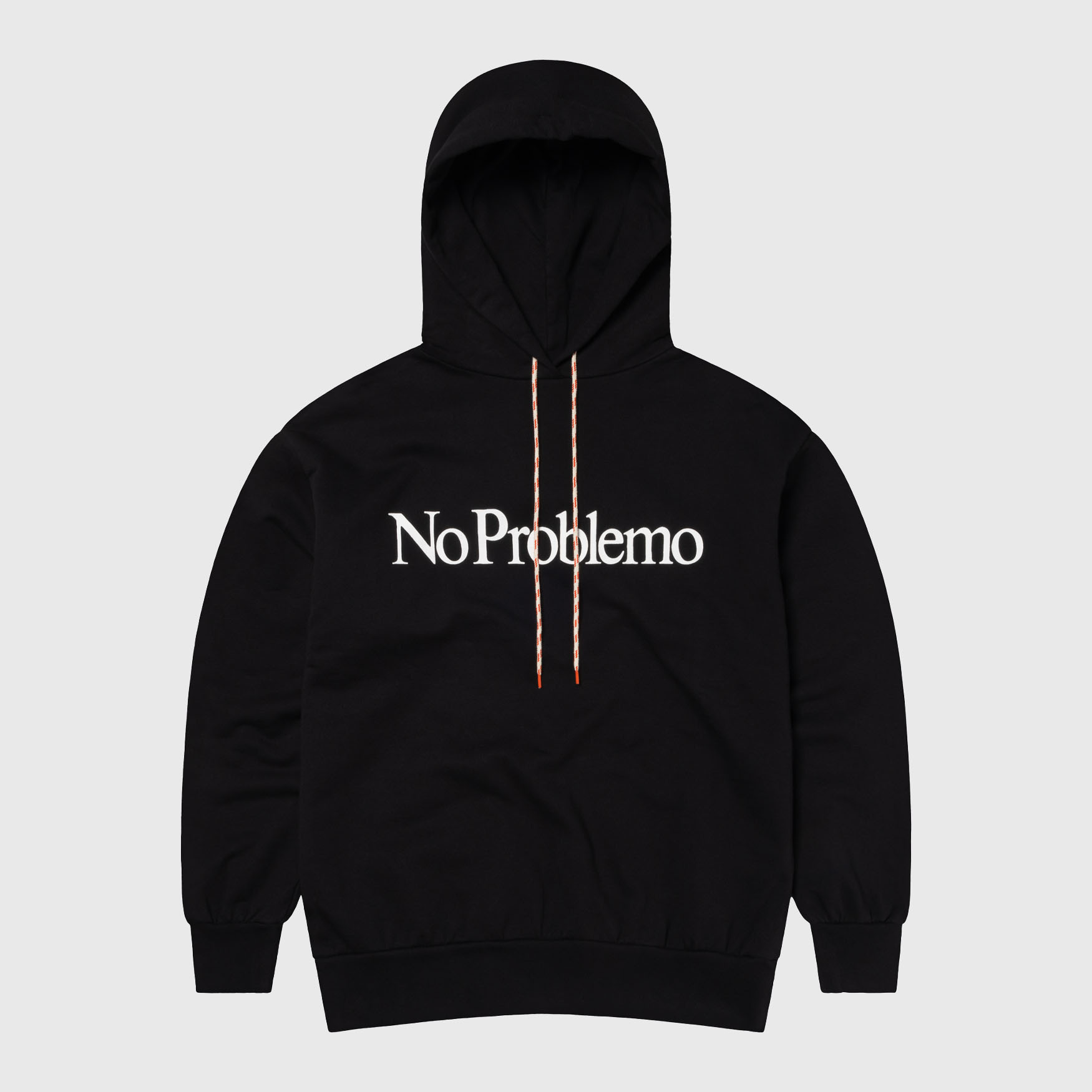 No Problemo Hoodie Black is a relaxed fit hoodie crafted from brushed-back 100% cotton jersey fleece. It features a drawstring hood, ribbed cuffs & hem, and a bold “No Problemo” screen-print on the front.