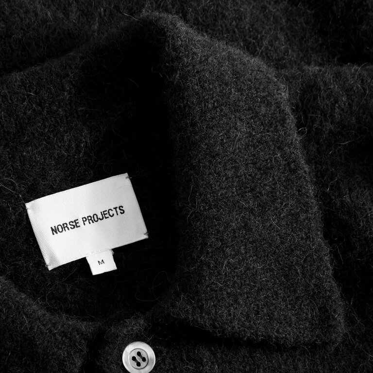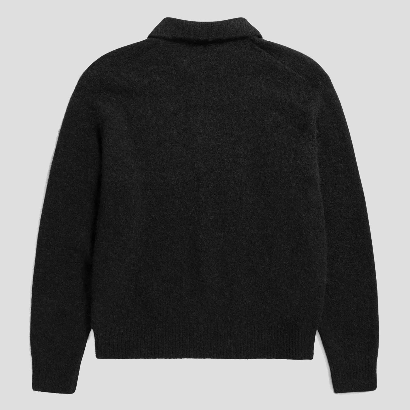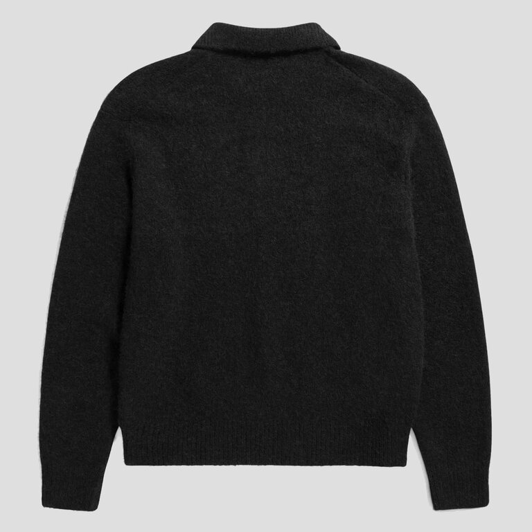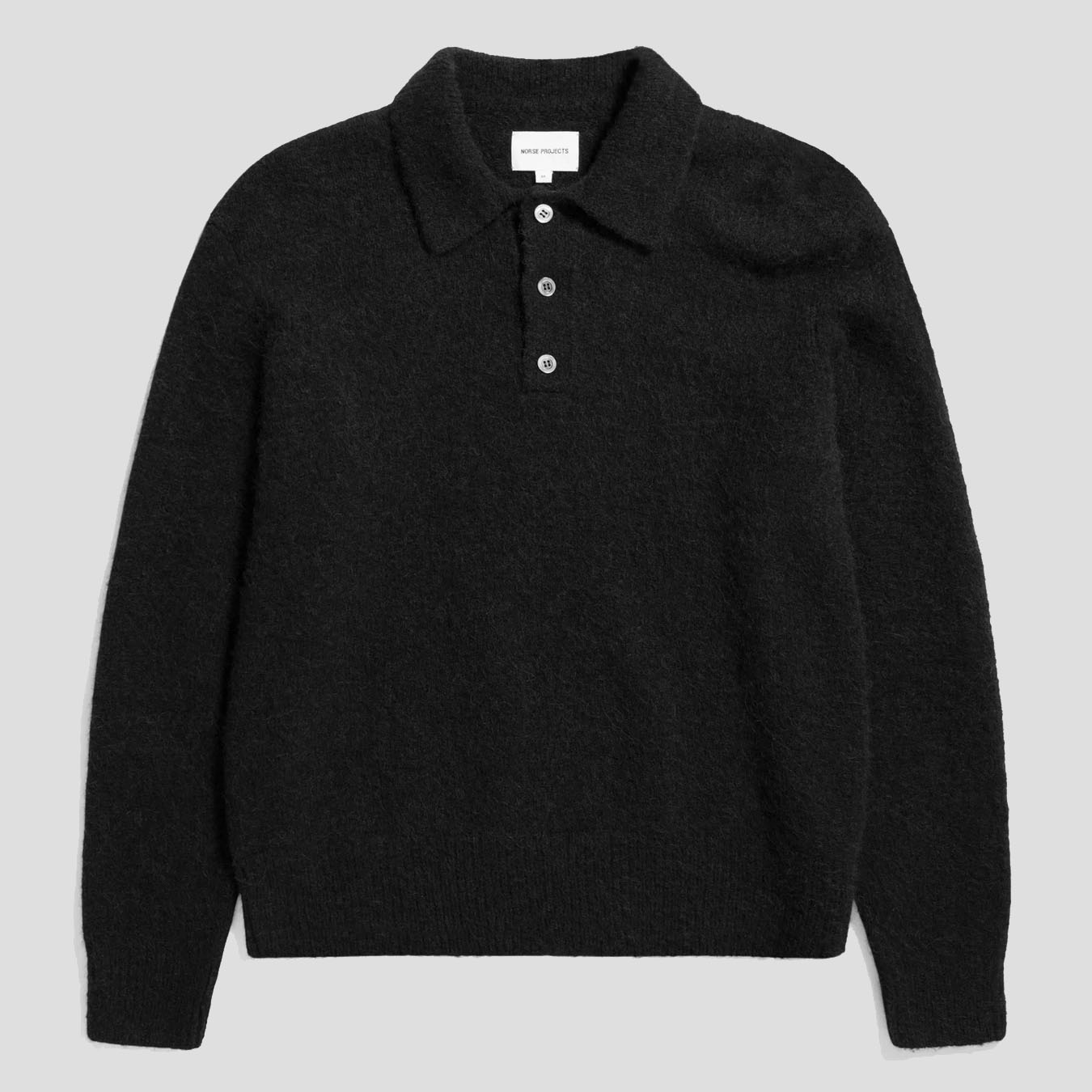 The Norse Projects Rasmus Relaxed Brushed Polo in Black is a polo knitted from an alpaca/wool blend in plain jersey. The relaxed fitting style is constructed with set-in sleeves, 2 button placket and finished with ribbed cuffs and hem.