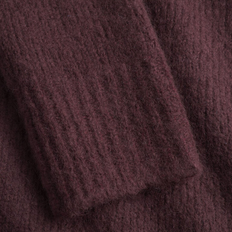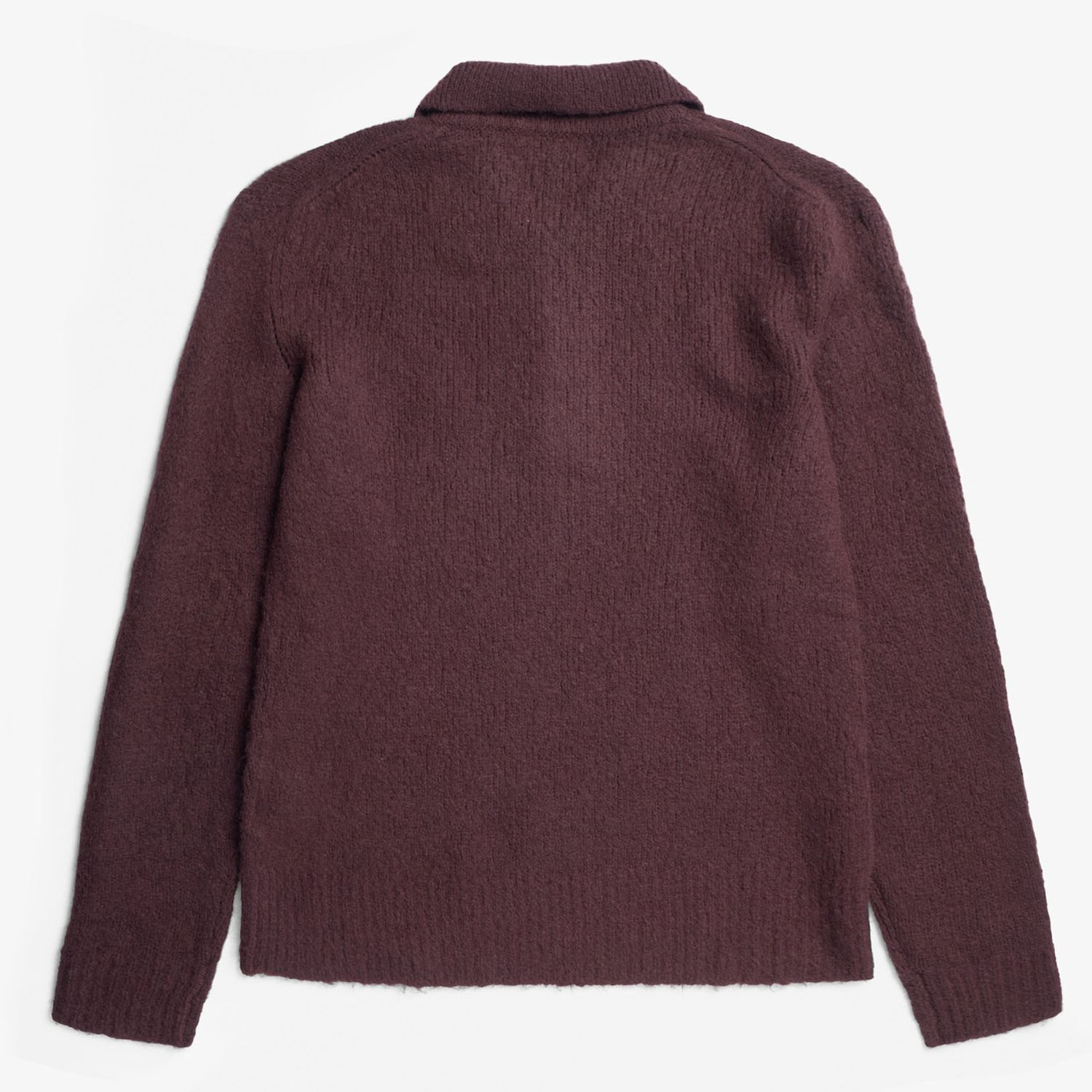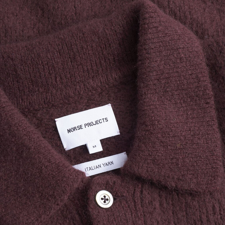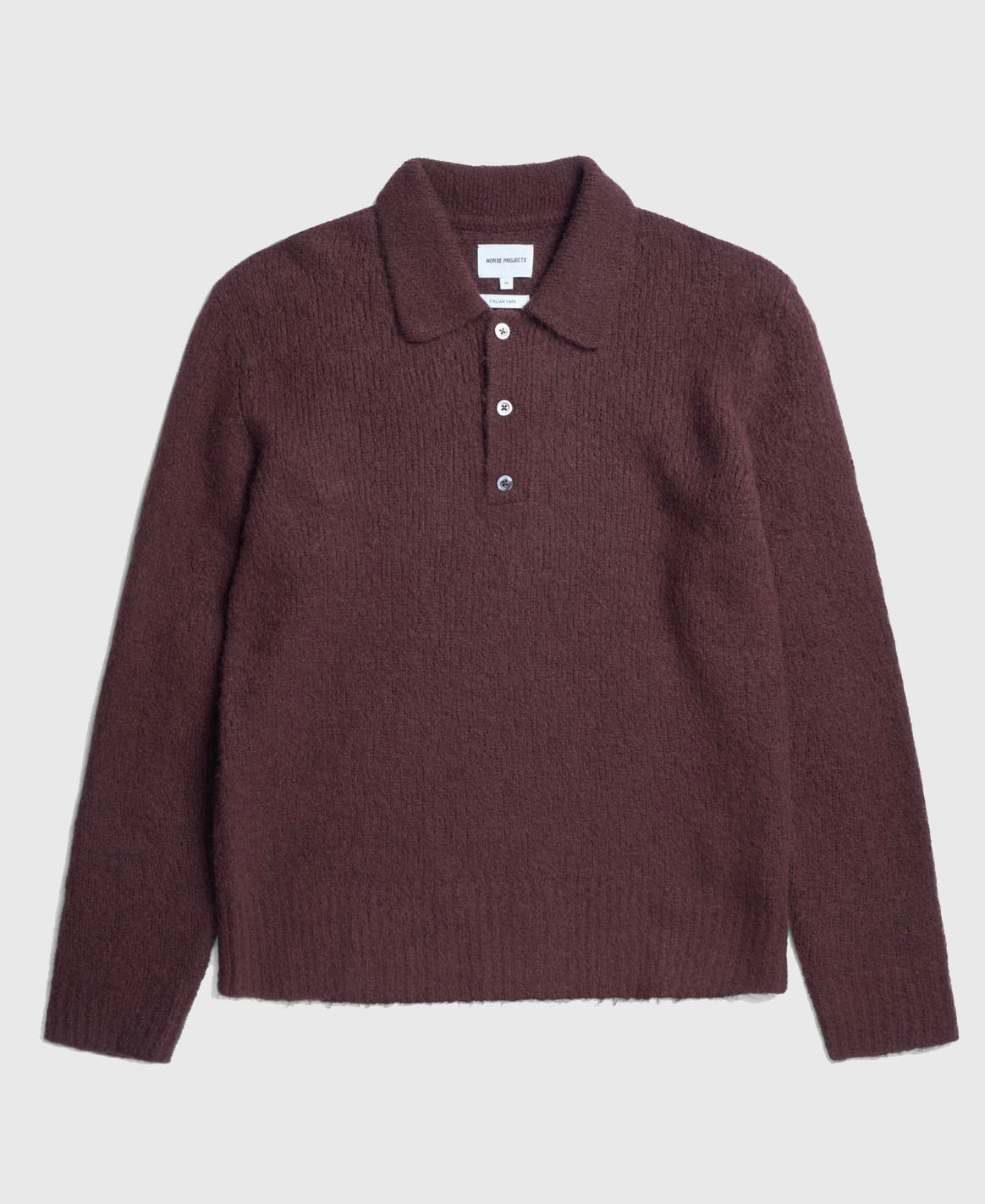 Norse Projects Rasmus Relaxed Brushed Polo Mahogany is knitted from an alpaca/wool blend with a brushed finish, featuring a relaxed set-in sleeve fit, two-button placket with mother-of-pearl buttons, and ribbed cuffs & hem for subtle sophistication.