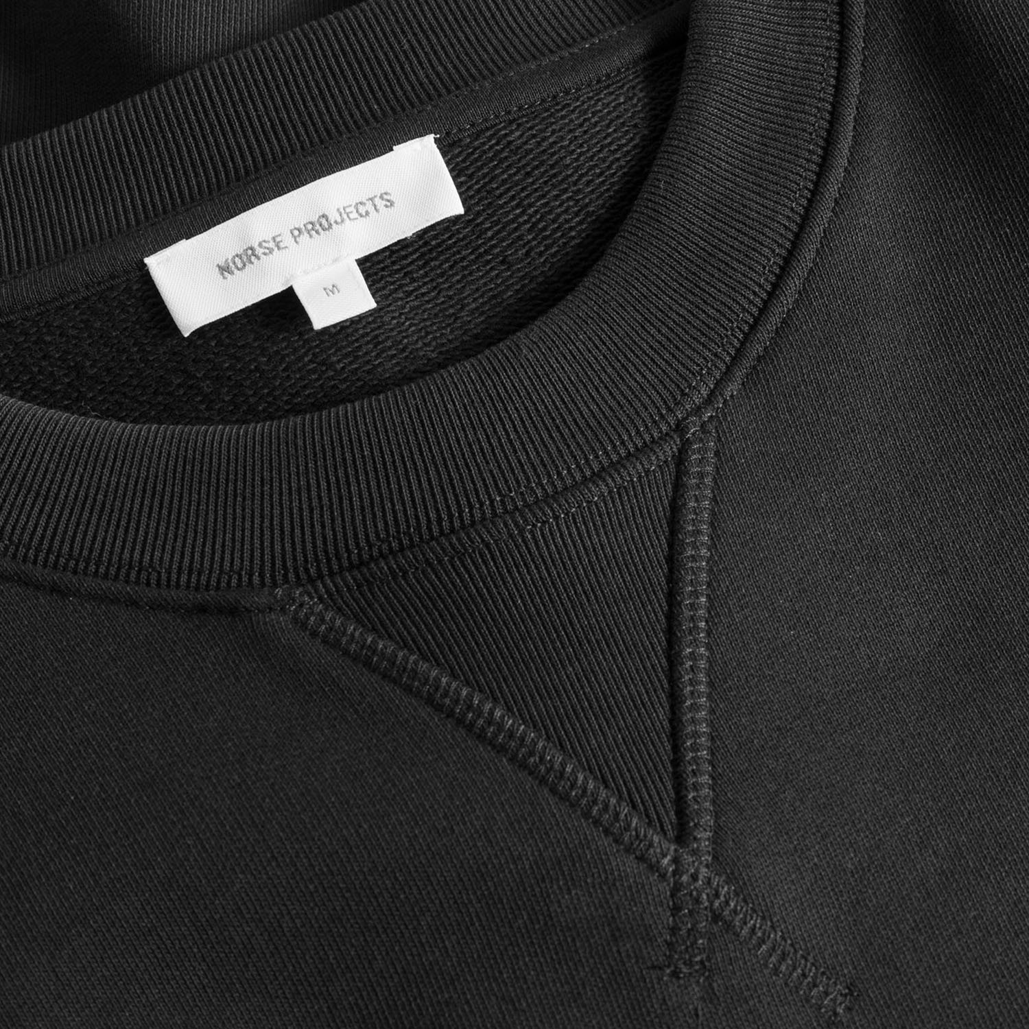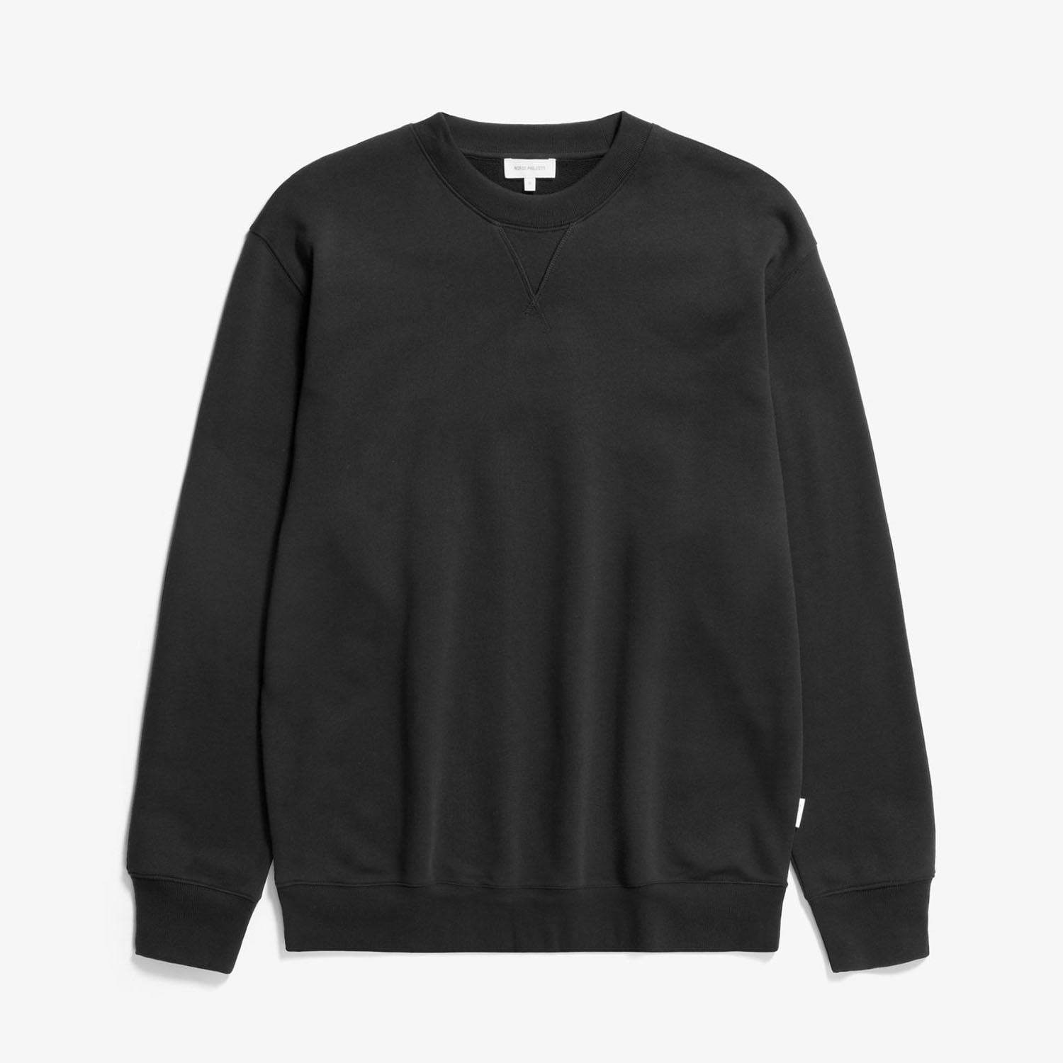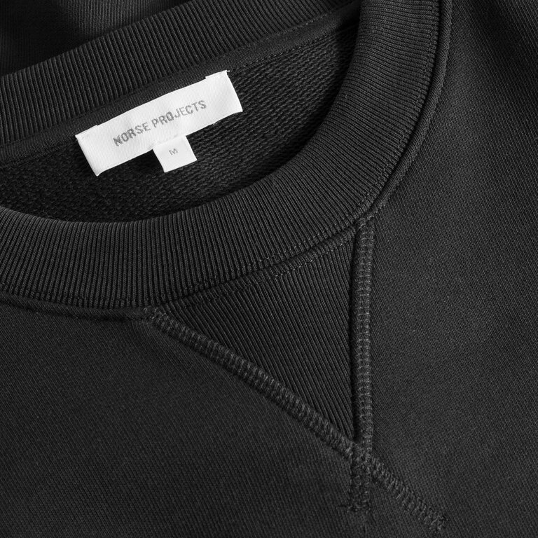 Norse Projects Standard Sweatshirt Black is built with 100% organic cotton heavyweight (≈ 385 gsm) loop-back fleece. It has a regular fit with set-in sleeves, ribbed collar, cuffs & hem, and is made in Portugal for premium craftsmanship.