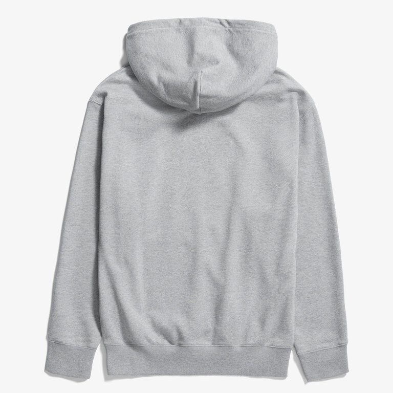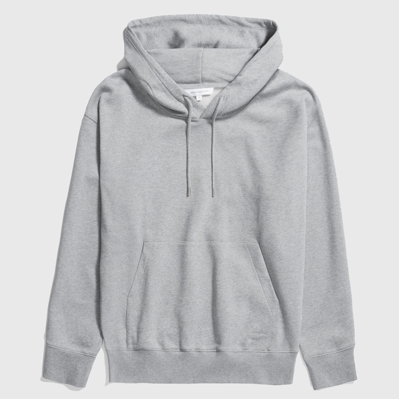 The Norse Projects Standard Hoodie in Grey Melange is made from midweight organic cotton, offering a regular fit. Crafted in Portugal, it features set-in sleeves, a loopback sweat finish, an adjustable double-layer drawstring hood with metal aglets, a kangaroo pocket, and ribbed cuffs and hem.
