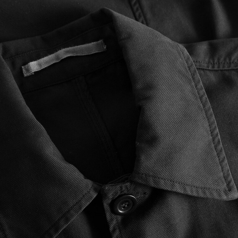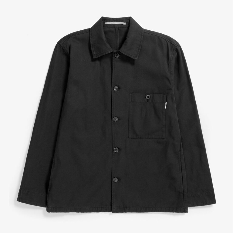 Norse Projects Standard Twill Overshirt Black is cut from densely woven 100% cotton twill with a straight, boxy regular fit. It features a classic collar, corozo buttons, a patch chest pocket and side seam pockets — great as an overshirt or lightweight jacket.