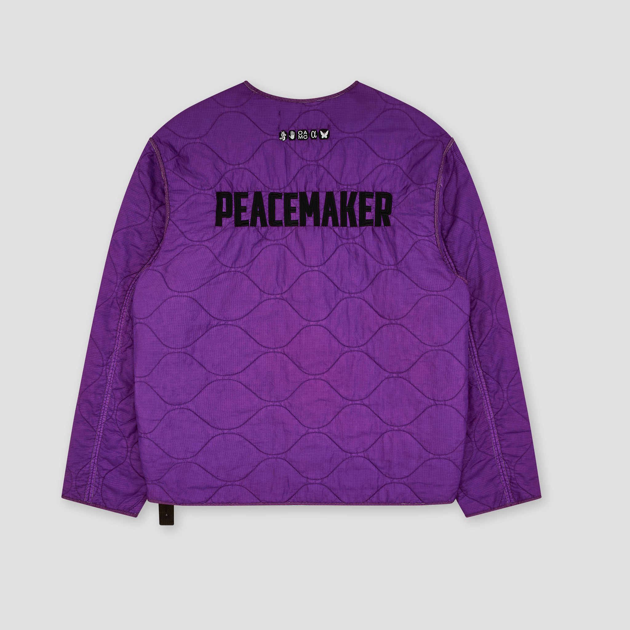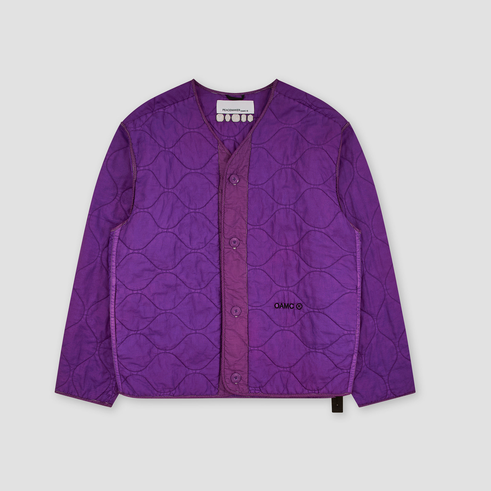 OAMC Peacemaker Combat Liner Purple is a quilted nylon ripstop jacket with garment-dyed finish, oversized silhouette, button closure, side seam pockets, and Peacemaker embroidery front & back.