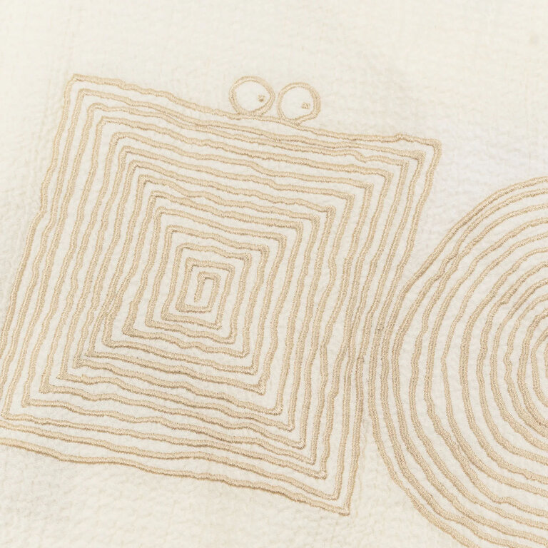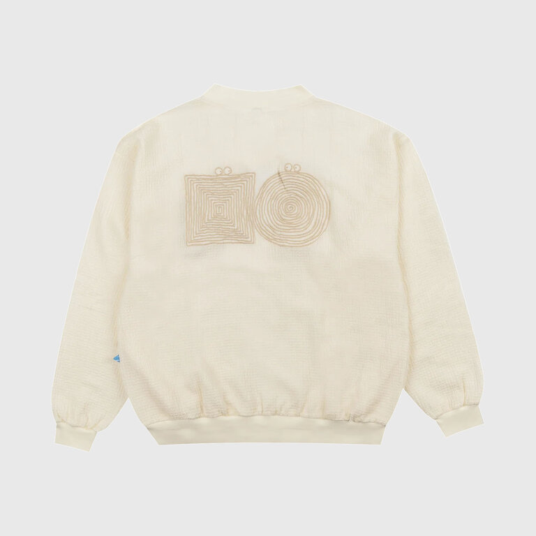 The Reception Foot Cashmere Sweat in Butterwhite is an loose fit sweat constructed out of an 135 Gr/M2 cotton/Cashmere Wool seersucker. This style has overall embroideries from artist Benoît François and sidepockets.