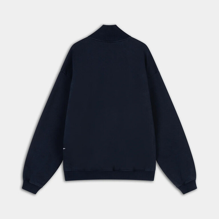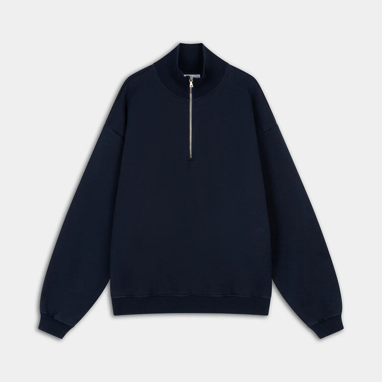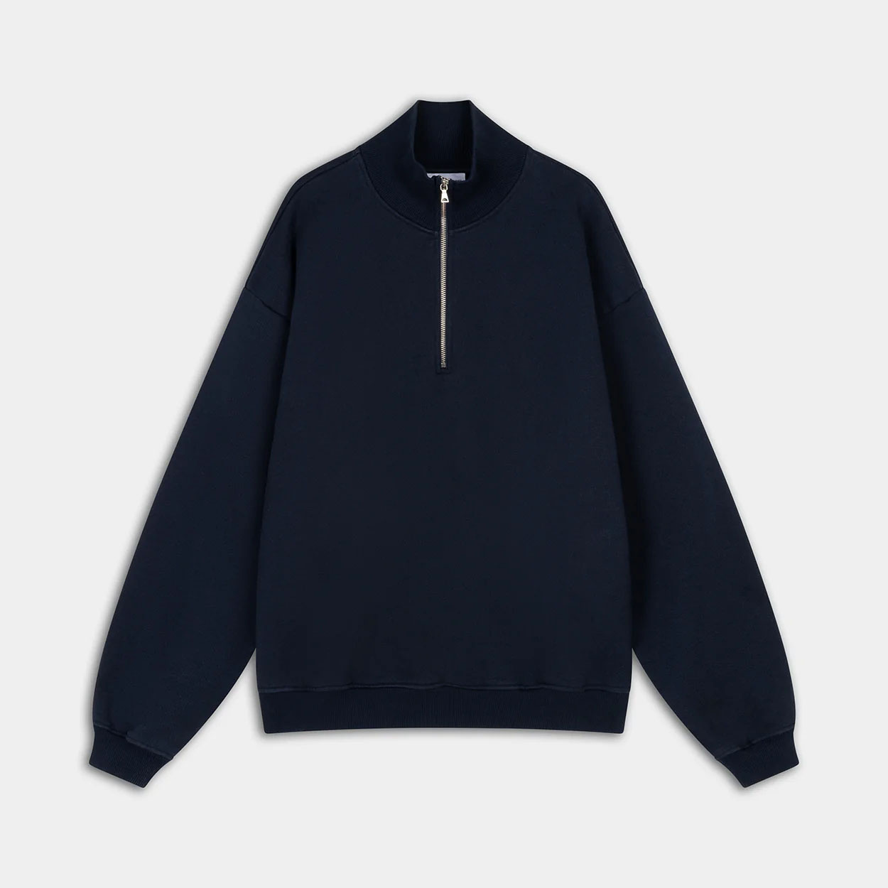 The Savage Report Half Zip Crewneck Navy – premium heavyweight cotton sweatshirt with a relaxed fit, half zip collar, and subtle branding. Ideal for layering or standalone wear.