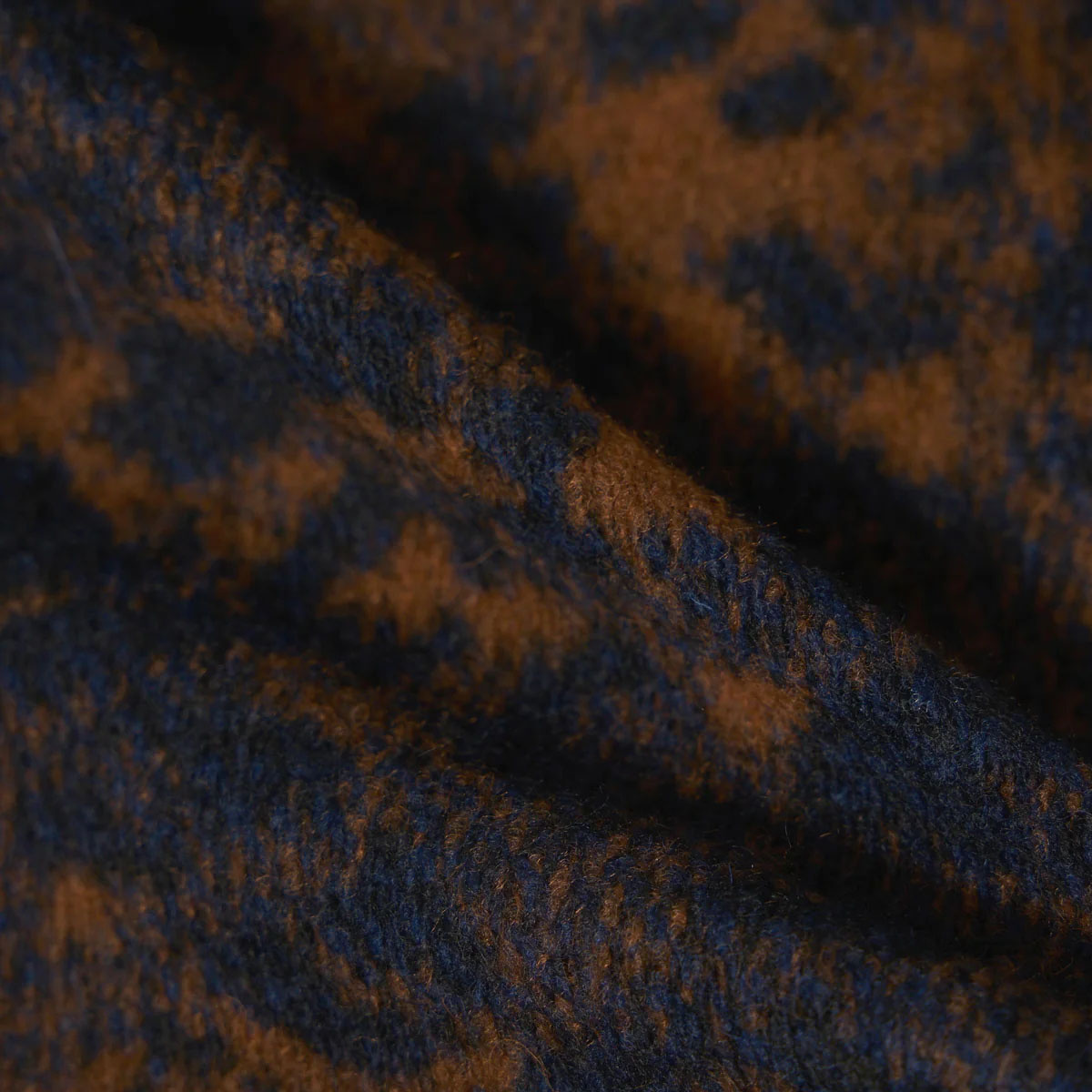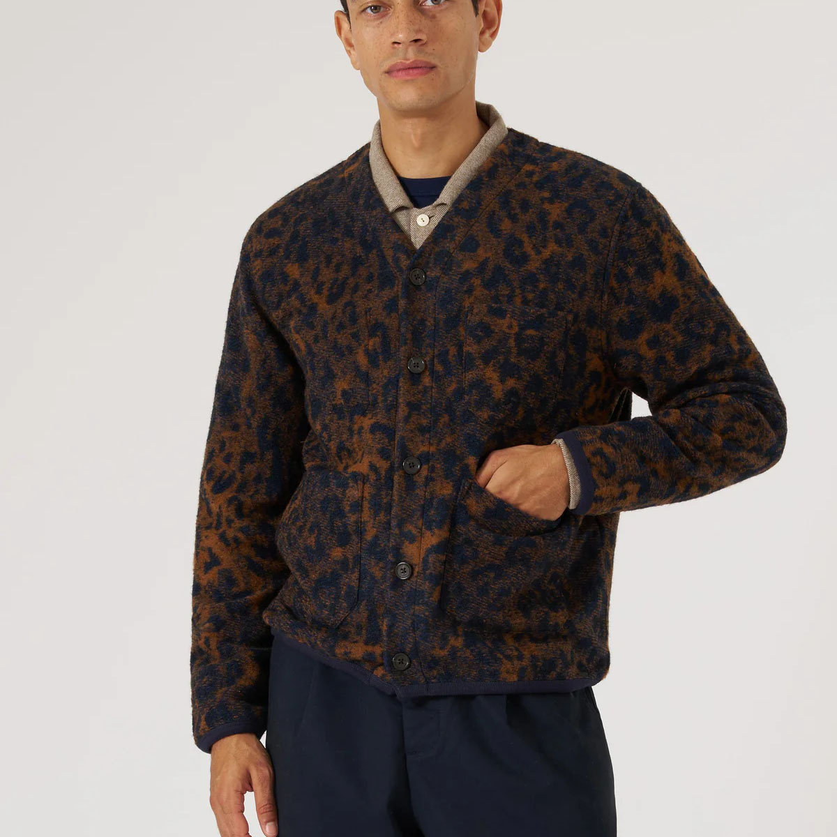 Universal Works Night Leopard Cardigan Dark Navy/Brown is a regular-fit buttoned cardigan in a mid-weight wool blend with custom leopard knit. Features include V-neck, rib-bound trims, three outer patch pockets, plus one inside, and bold Night Leopard pattern.