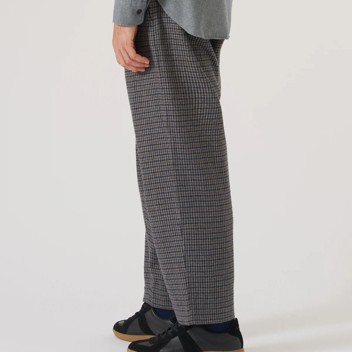 Universal Works Oxford Pant Houndstooth Wool Mix (Charcoal) features a wool-blend houndstooth weave, wide taper cut, elastic drawstring waist, single front pleat, and functional front/rear pockets—tailored ease meets textured refinement.