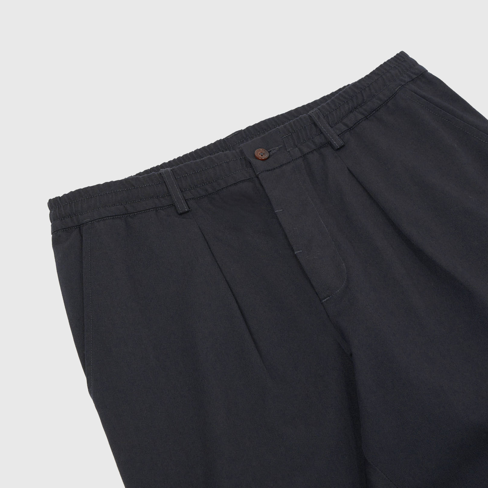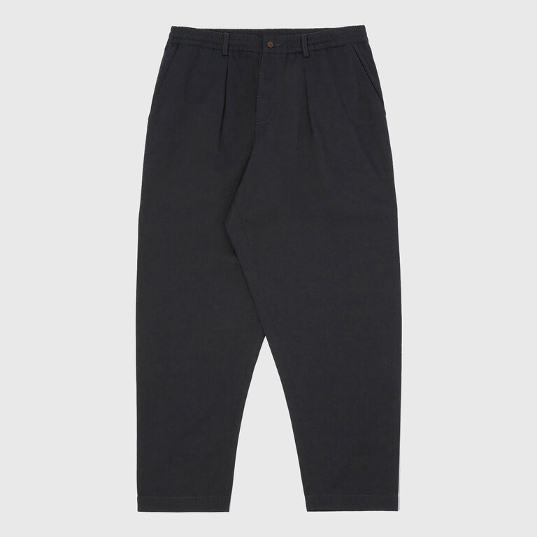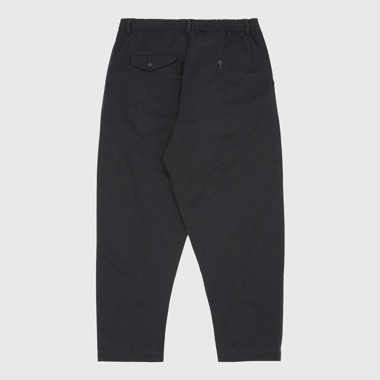 The Universal Works Universal Works Pleated Trackpant in Black Twill is a loose tapered pant with an elasticated waist and drawcord. Has a sigle front pleat, button fly. Two front pockets and two rear pockets, one buttoned single jetted.