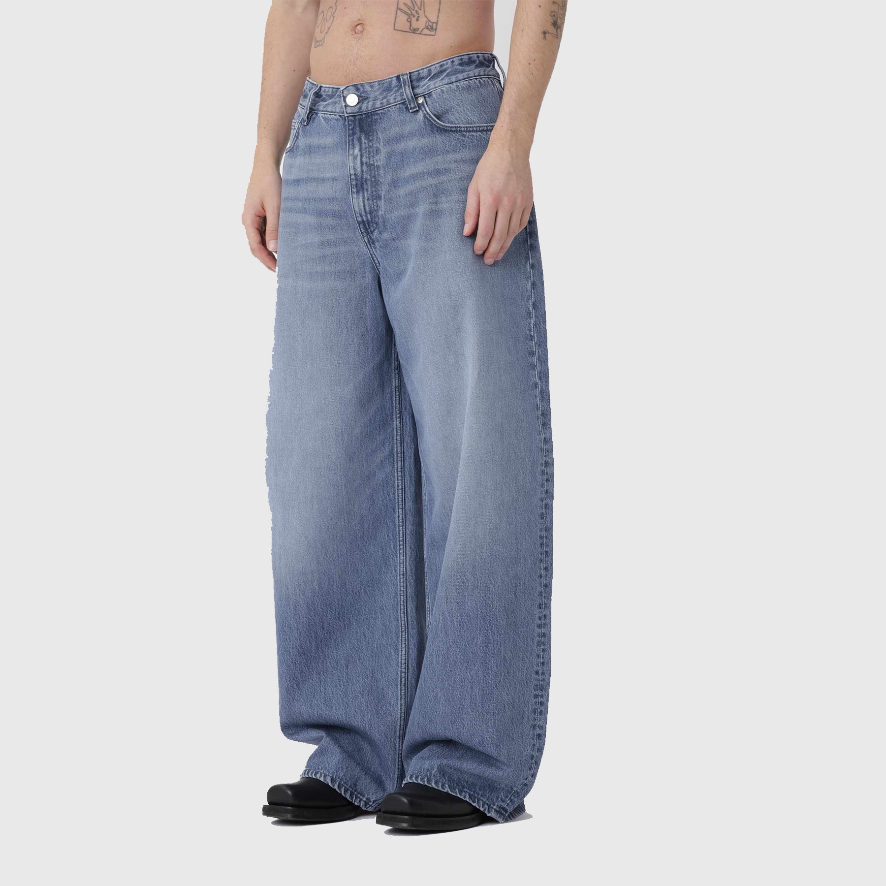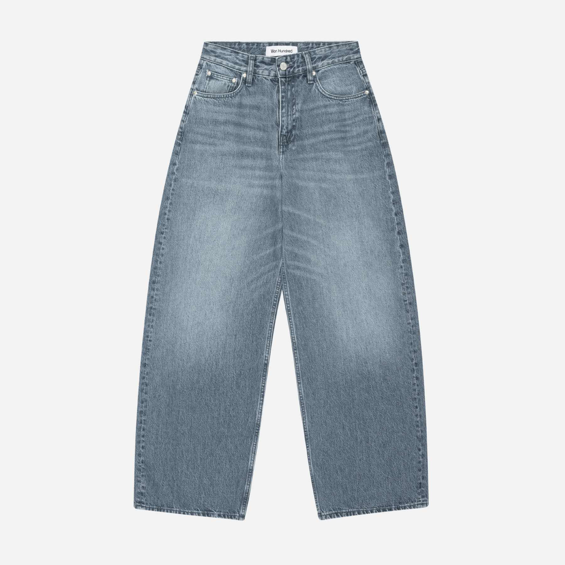 The Won Hundred The Lyon Stormy Blue Jeans is designed with a baggy fit, a low waist, and a wide, slightly cocoon-shaped leg. Crafted from organic cotton denim in a classic blue wash, the style is finished with a metal logo button and zip closure.