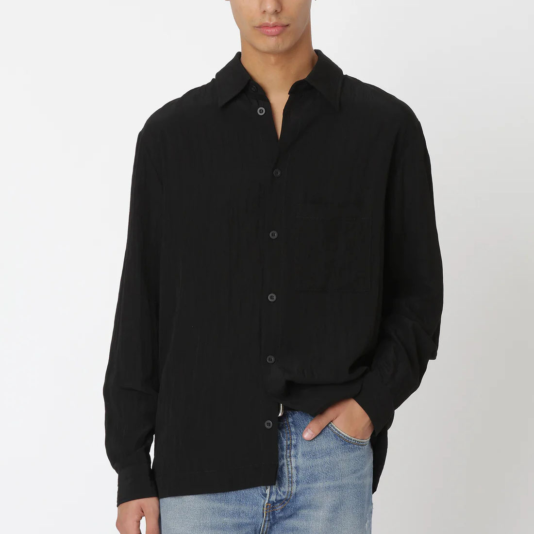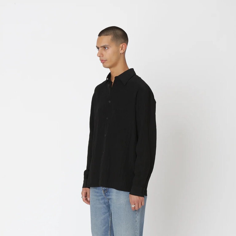 The Won Hundred Penzo Rayon Shirt in Black is crafted from a lightweight, textured rayon that drapes effortlessly for a relaxed silhouette. It features a front button closure and a squared chest pocket, combining ease with subtle structure.