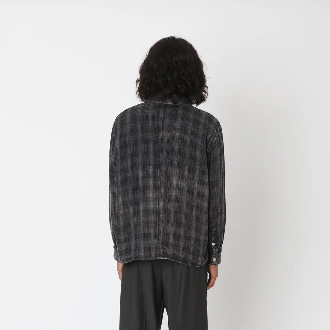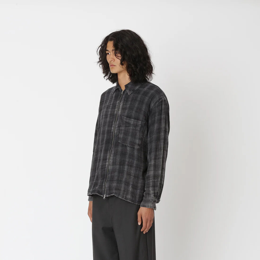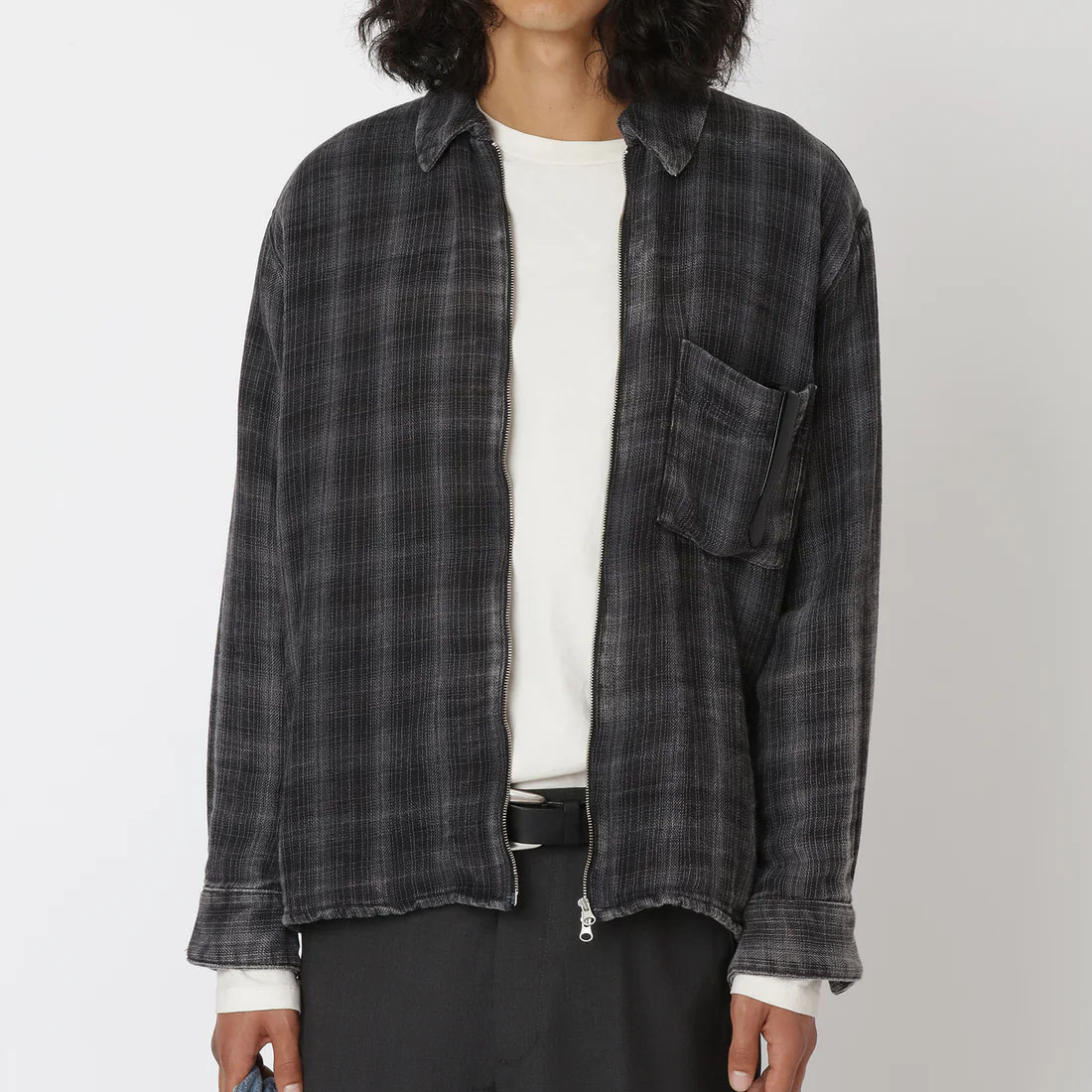 The Won Hundred Zayne Zip-Shirt in Bleached Black features an oversized fit and is crafted from 100% cotton in a washed check pattern for a lived-in aesthetic. It is finished with a front zip closure and a low-set front pocket, adding a utilitarian edge to the relaxed silhouette.